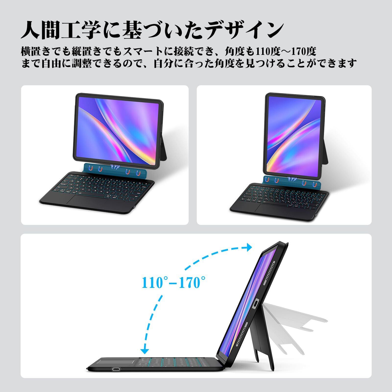 【充電やBluetoothペアリングなしのキーボード】iPadを接触位置の磁石で取り付けてすぐ使用することができます。電源はiPad本体から供給され、自動的にペアリングされるため、面倒なBluetoothペアリングやキーボードの充電の必要がなくなり、仕事や日常使用がより便利になります。