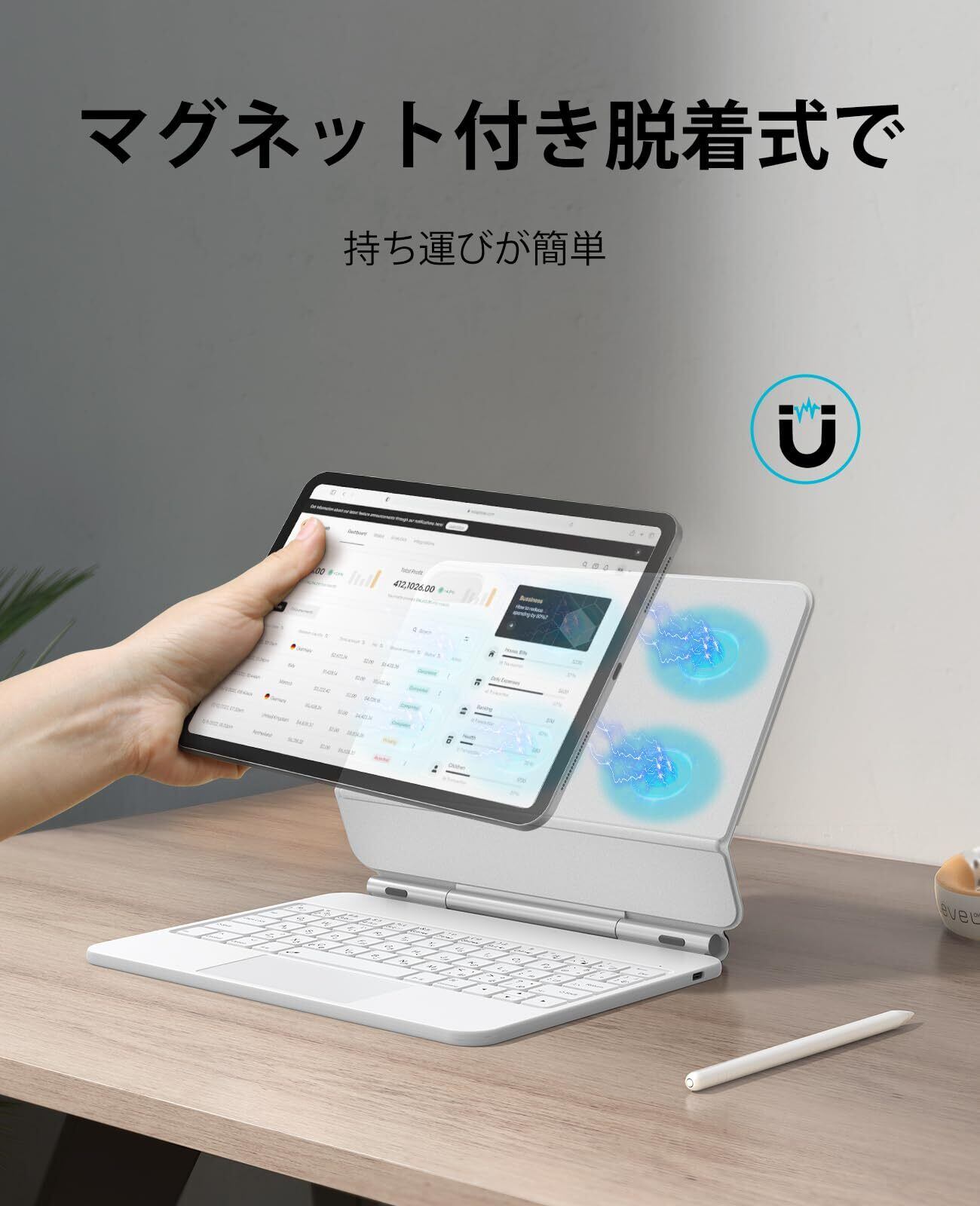【マグネット式デザイン】 マグネット式のカバーを開いてiPadを置くだけで、視野角の調節が可能なホバリングセットアップが完了します。 キーボードケースの外層は合成皮革で、折りたたむとiPadの前面と背面を保護する超薄型の保護カバーになります。