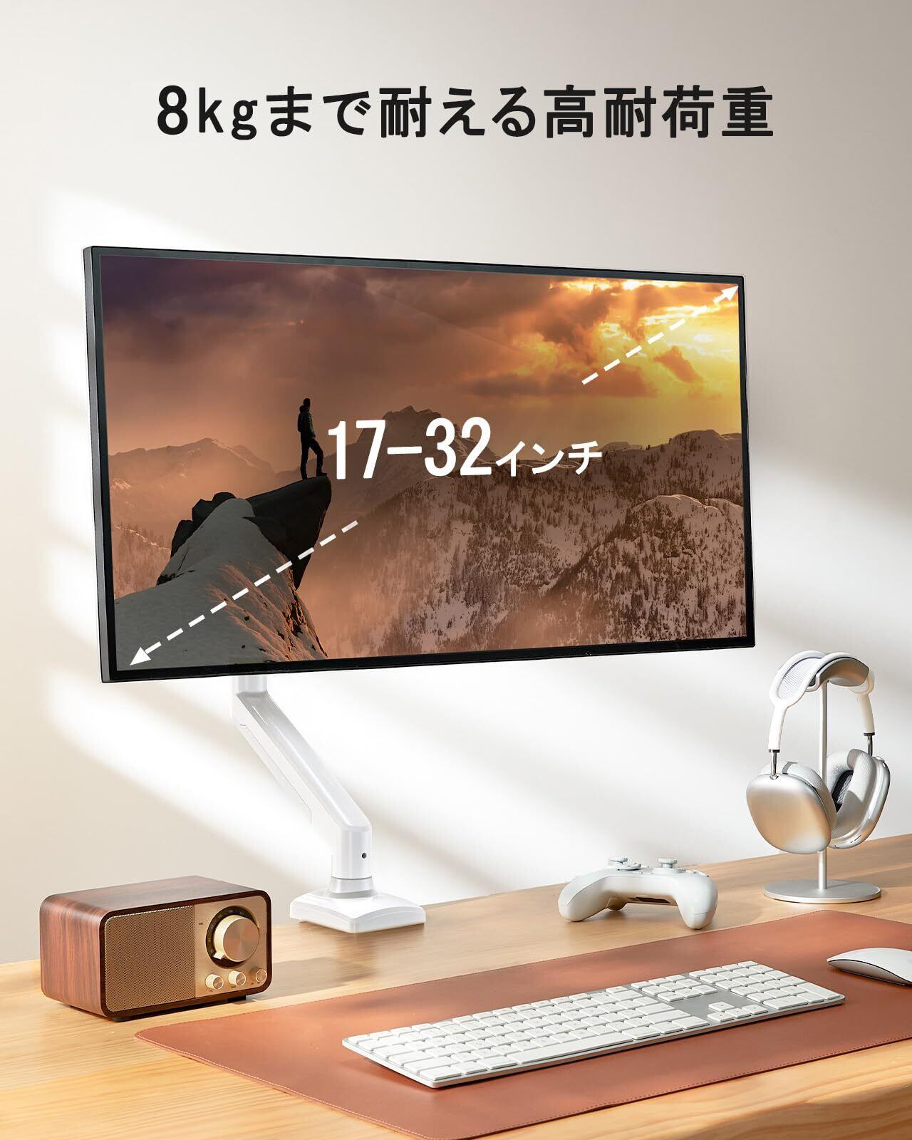 ErGear PC モニターアーム 13-32インチ対応 耐荷重2-8kg ホワイト/白 ディスプレイアーム pc vesa アーム ガススプリング式 シングル クランプ式 グロメット式