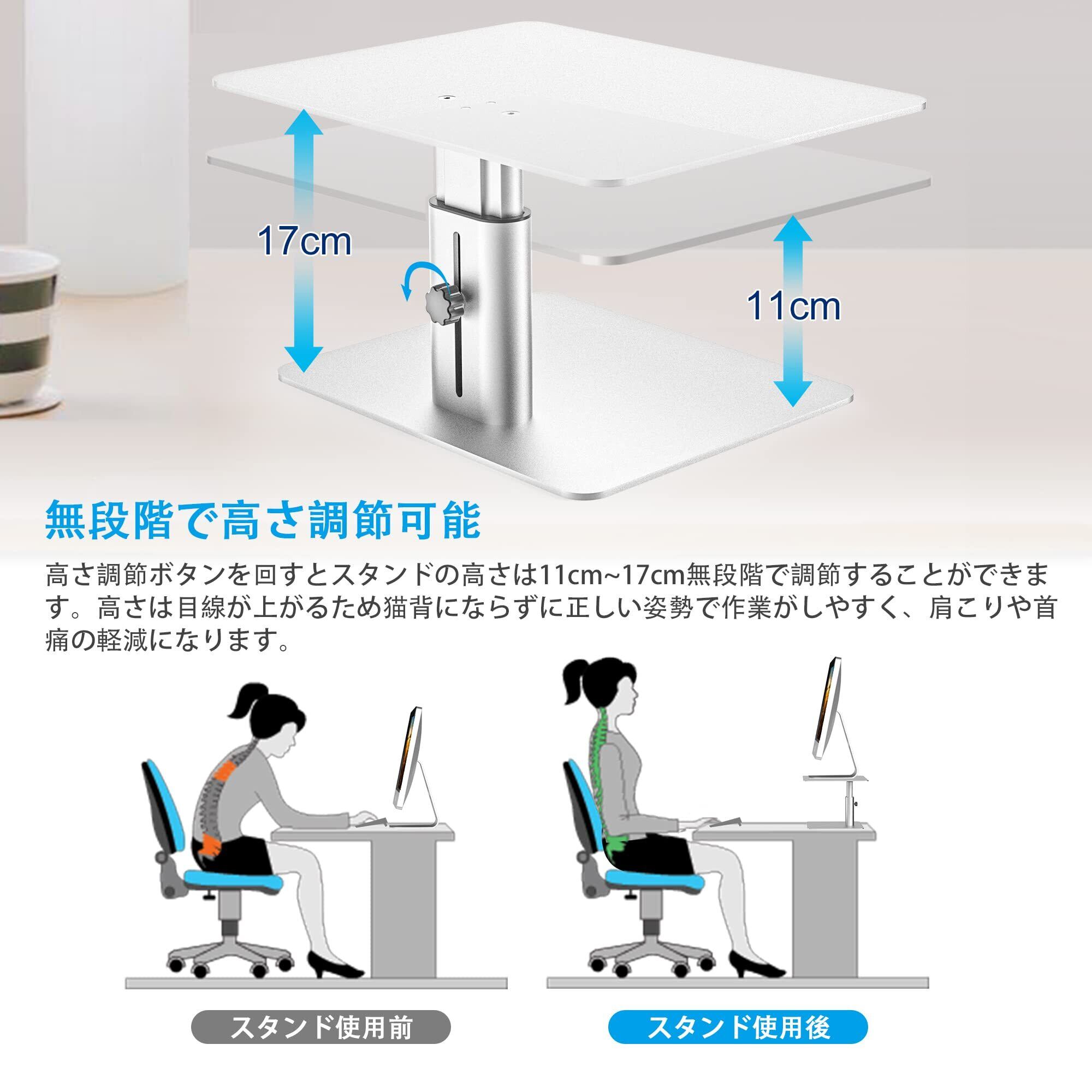 【高さ調節で姿勢改善】:商品サイズ(cm):(天板)幅約29cm×奥行約23cm、(底板)幅約23.7cm×奥行約20cm、高さ11cm~17cmまで調節。モニタースタンドの支柱のネジで高さが11~17cmまで無段階で調節することが可能で、作業しやすい好みの高さに合わせて最適な目線にディスプレイの高さを調整することができます。視線が上がることで猫背などの悪い姿勢が解消され、肩こりや首痛や目の疲労も軽減し、お仕事の効率も改善できます。(ご注意:スペースが足りないことを避ける為に、卓上のスペースをご確認の上でお買い求めください。)
