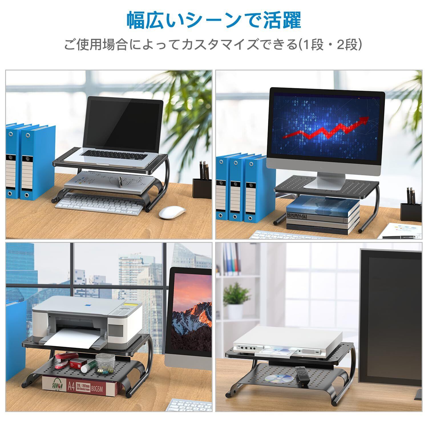 【省スペース】2段棚でデスク上のスペースがより活かせて、大容量収納できます。モニター以外に、プリンターや電話機、FAX、本など色々なものが設置できるのでシーンを選ばる多機能に使えます。