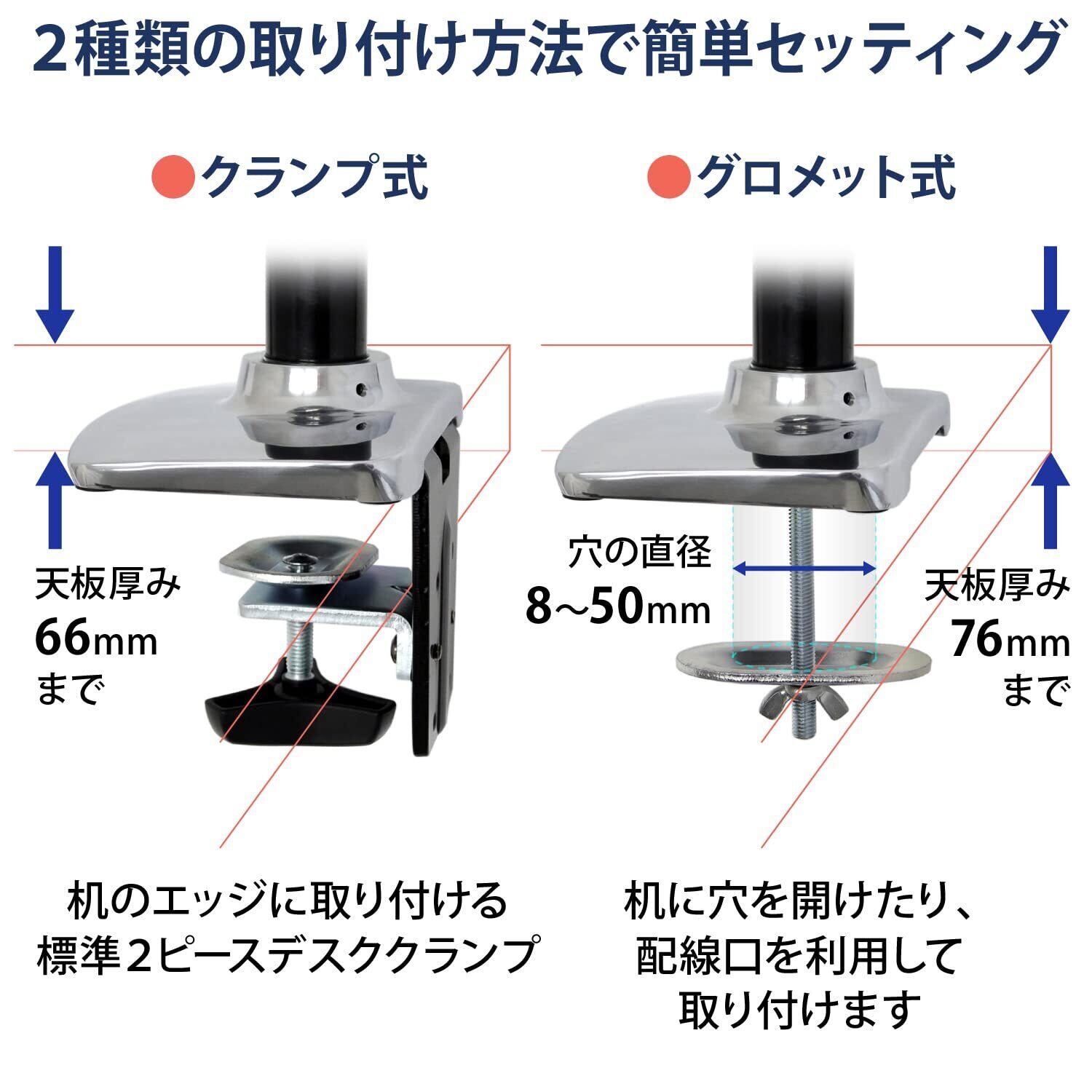 デスククランプは66mmの厚さに取り付け可能。
