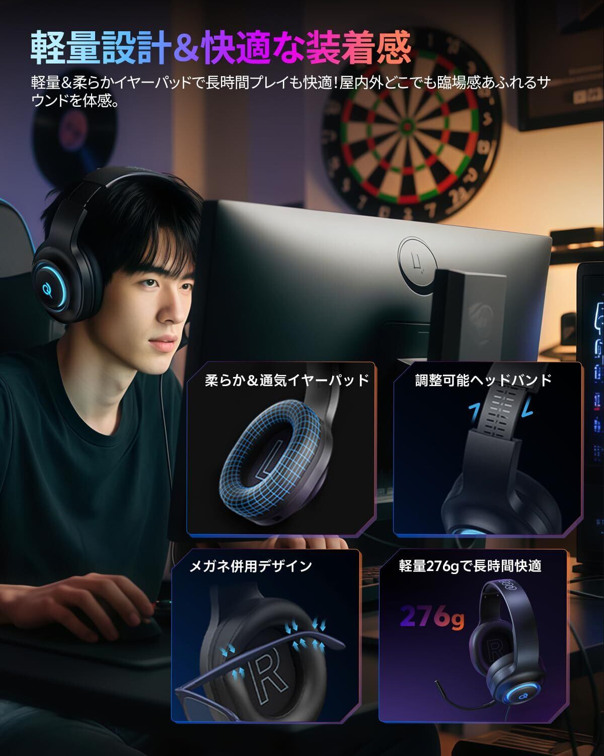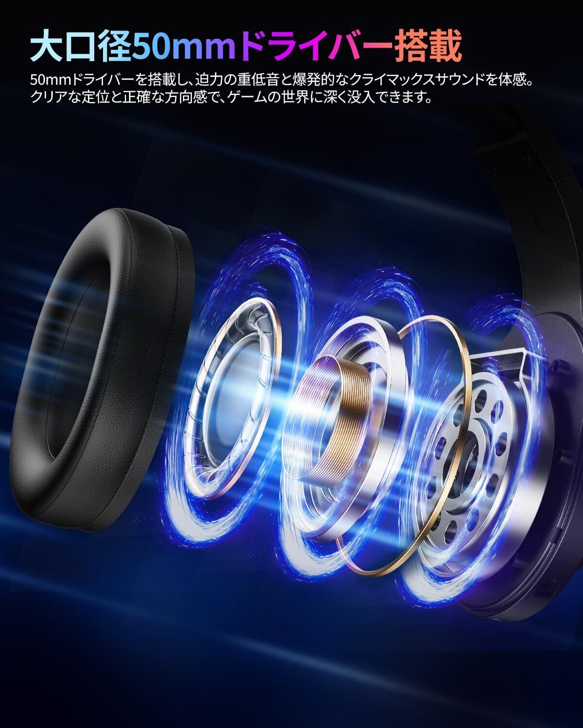 【大口径50mmドライバー&圧倒的なサウンド】このヘッドホンは7.1chサラウンドに対応し、立体的な音場を再現し、左右だけでなく前後や上下などあらゆる方向からの音の位置を正確に把握可能。高精度50mmドライバーにより、ハイレゾ音源のクリアで繊細なサウンドを実現し、敵の足音や爆発音などの細部まで鮮明に再生します。MOBA、FPS、RPG、Switch、荒野行動はもちろん、Apex Legends、PUBG、VALORANT、Final Fantasy XIV、モンスターハンターシリーズなど、多彩なゲームで没入感あふれるプレイ体験を提供します。