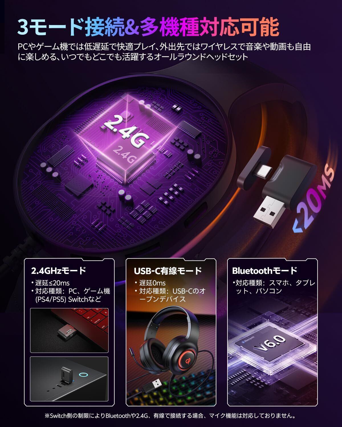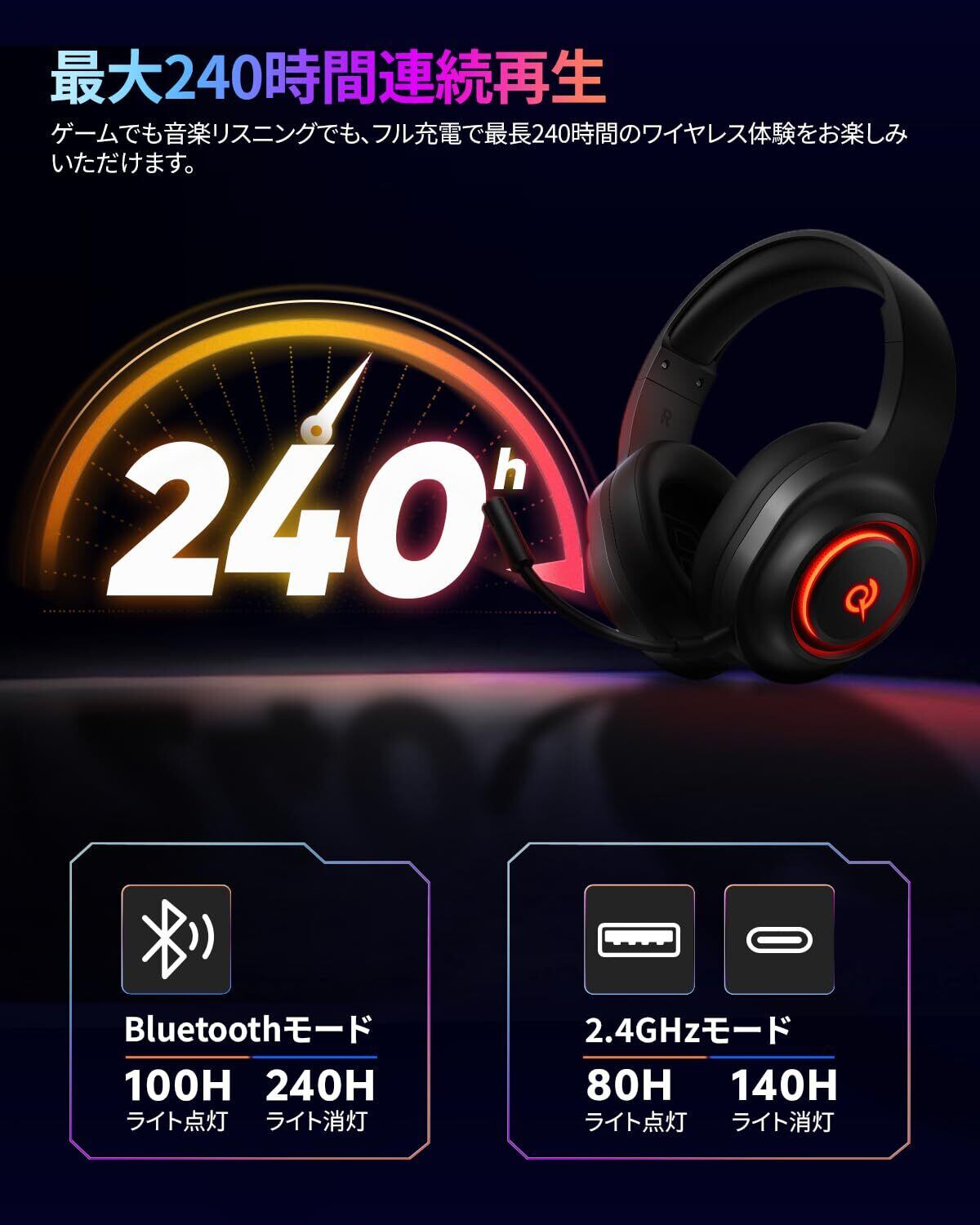 QCY Heroad V200 ゲーミングヘッドセット 7.1ch サラウンド 50mmドライバー【USB 2.4GHz/Bluetooth 6.0/有線】3WAY接続 マイク付き ゲーミングヘッドホン 低遅延 軽量 最大220時間再生 RGBライト ゲーム用 ヘッドフォン PC PS4 PS5 Switch スマホ対応 ブラック