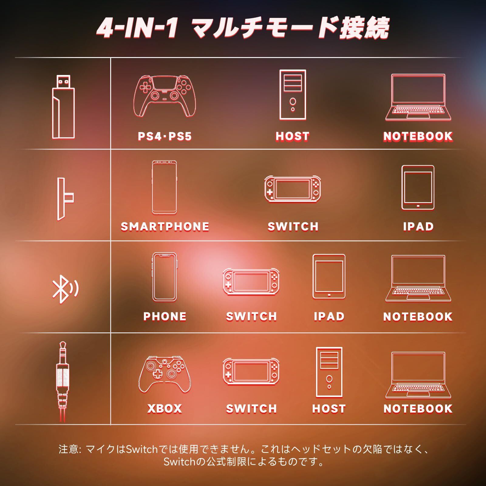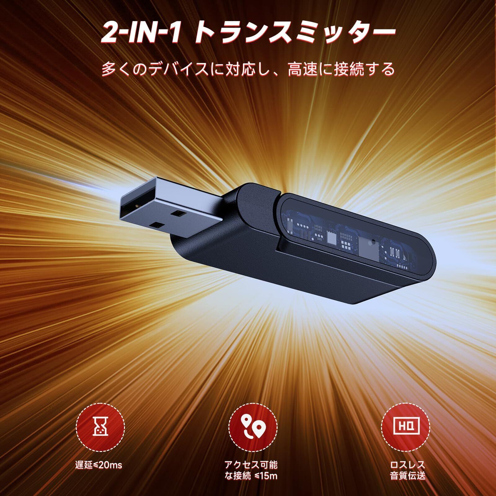 【最新版4way接続&幅広く互換性】2025最新版type-C接続できるワイヤレスゲーミングヘッドセットはトランスシッターが取り外し可能なデザインを採用しており、USB-AとType-Cの2つのインターフェースを備えています。① 2.4GHz type-Cワイヤレス接続:スマートフォン②2.4GHz USB-Aワイヤレス接続:PS5、PS4、パソコン、PC、 Switch ③ Bluetooth 5.3接続:スマートフォン、Laptop。④ 3.5MM有線接続: PS4/5、Switch、PC、xboxone。 従来の旧製品より、Type-CインターフェースでSwitchやスマートフォンに接続可能です。2in1ワイヤレストランスシッターはコンパクトで便利で、指を邪魔したり、他のインターフェイスの位置を占めたりしません。超低遅延2.4Gモードを使用してスマートフォンでゲームをプレイすることができます。