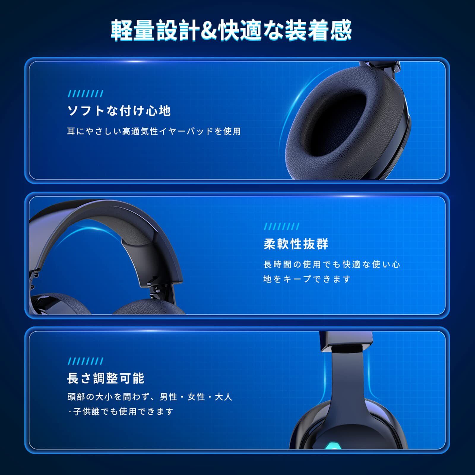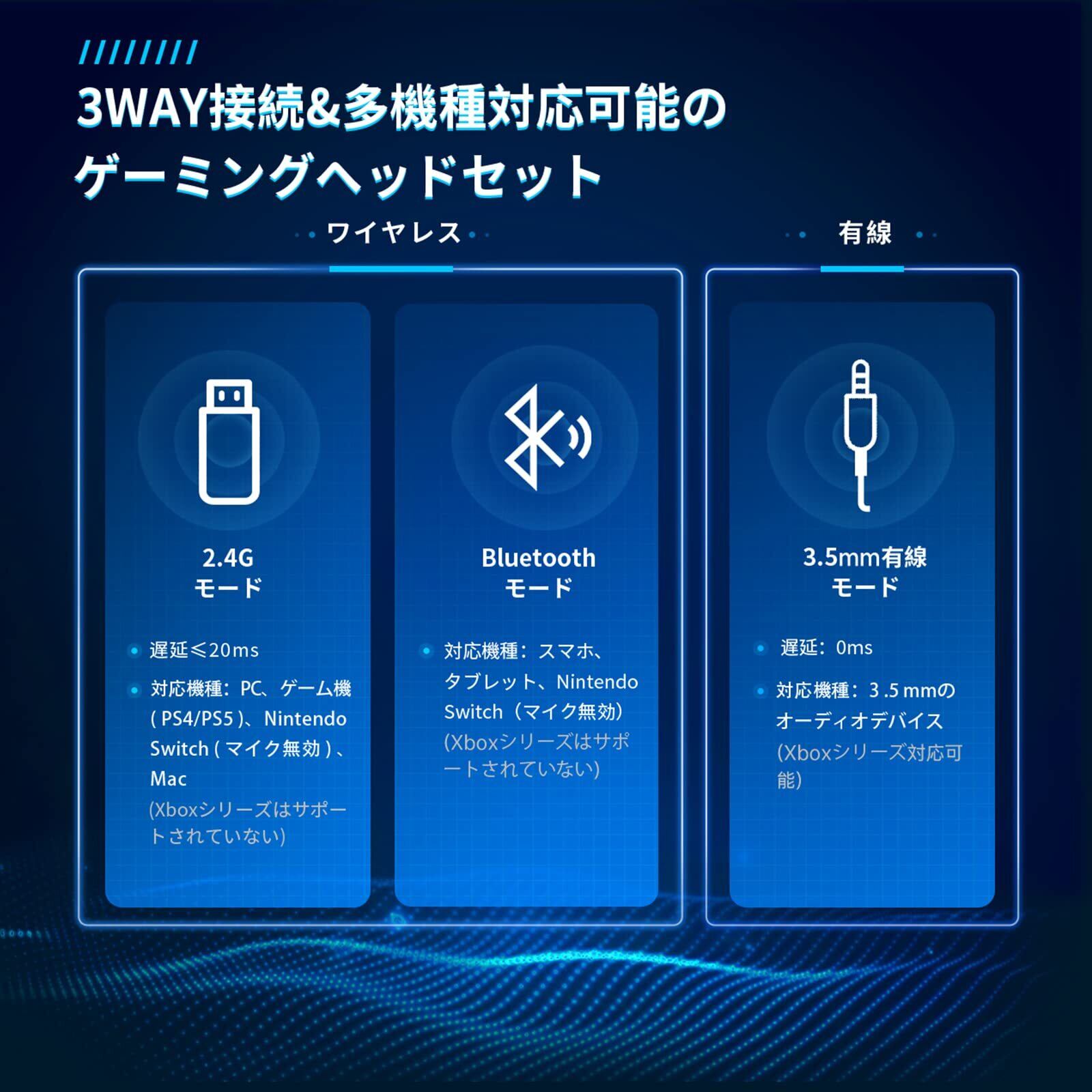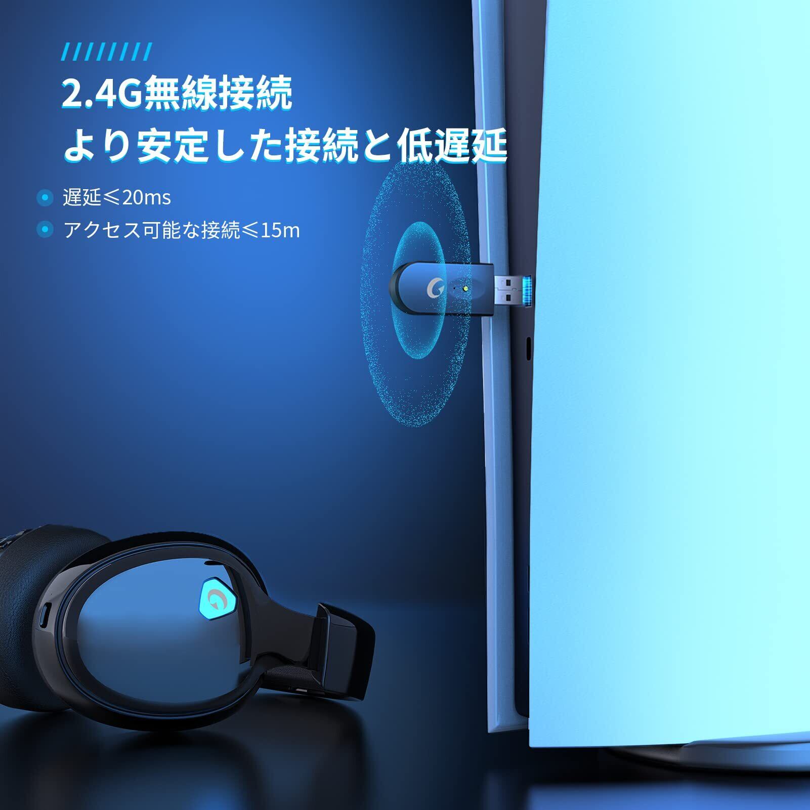【ワイヤレス/有線対応&USBアダプター/Bluetooth 5.3/有線 3WAY接続可能】 Gvyugke CT300ゲーミングヘッドセットは無線による信号遅延や干渉を感じさせなく、ロスレスHI-FI音質を伝送できます。 ※※2.4GUSBモード:2.4G無線接続で、遅延が少なく、外部からの干渉を受けない、堅牢なワイヤレスオーディオを実現。ヘッドセットに付属しているUSBトランスミッターをPC/PS5/PS4/Macなどに挿すだけで、最大10mの受信距離以内にケーブルの縛りがなくゲームを楽しめます。 ※※ヘッドホンのモード切替ボタンを押すと2.4GやBluetoothモード切替できます。 こちらのゲーミングヘッドホンは汎用性の高いBluetooth5.3搭載・自動ペアリング・信頼性とエネルギー効率の高い接続が実現しました。