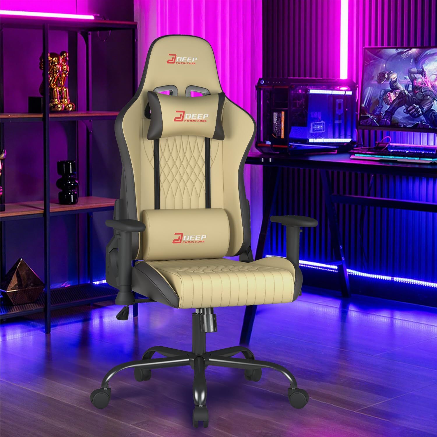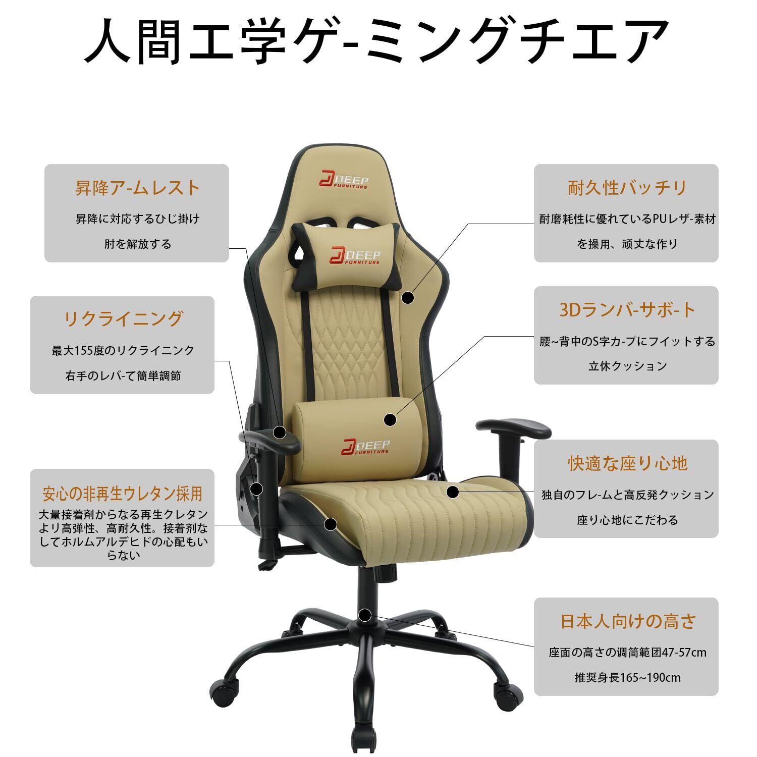 DEEPfurnitureは、eスポーツチェア、ゲームチェアの専門メーカーです。背もたれ機能付きの高背デザイン、ヘッドレスト、腰部サポート、アームレスト、高さ調整機能を搭載。PUレザー(ベージュ)を採用しています。