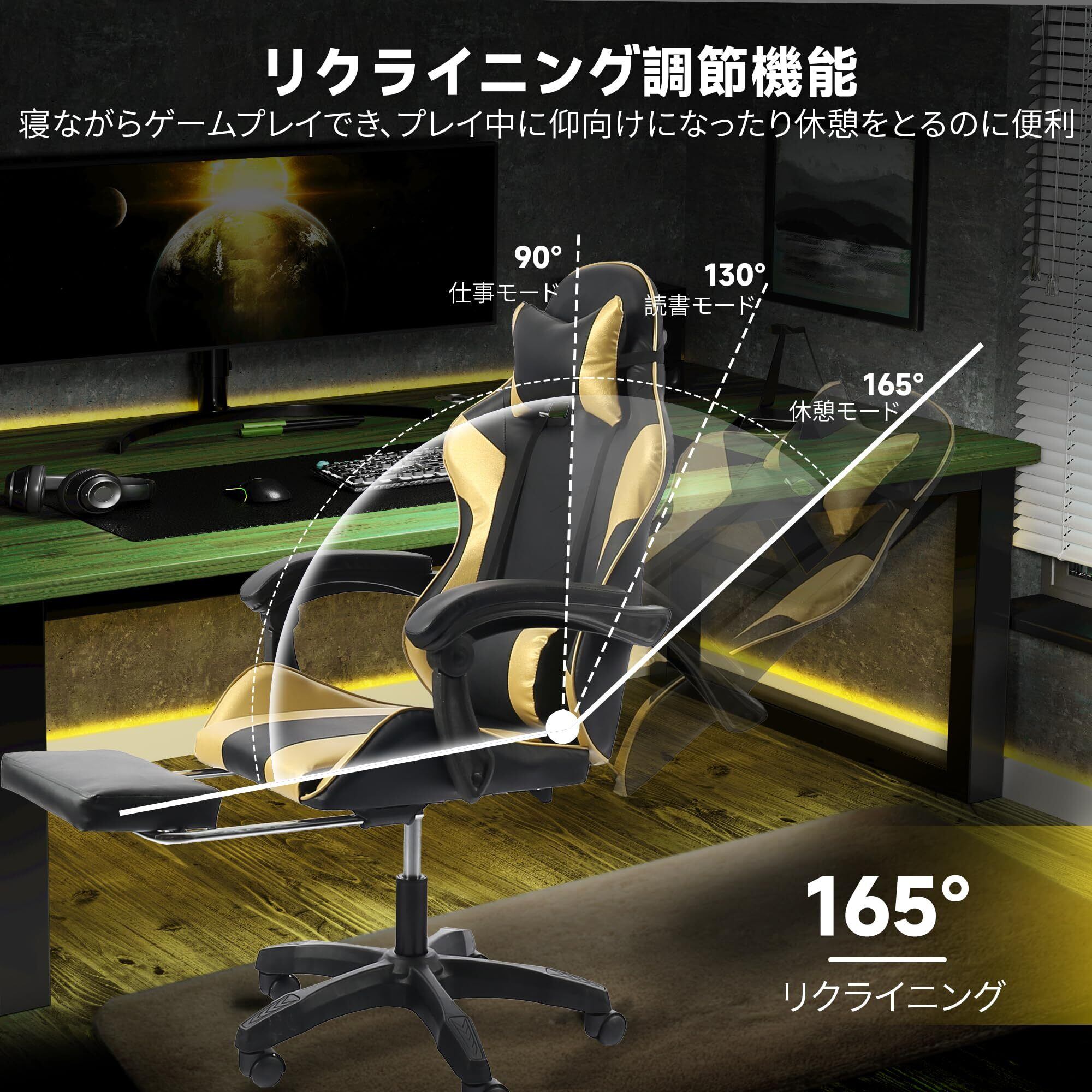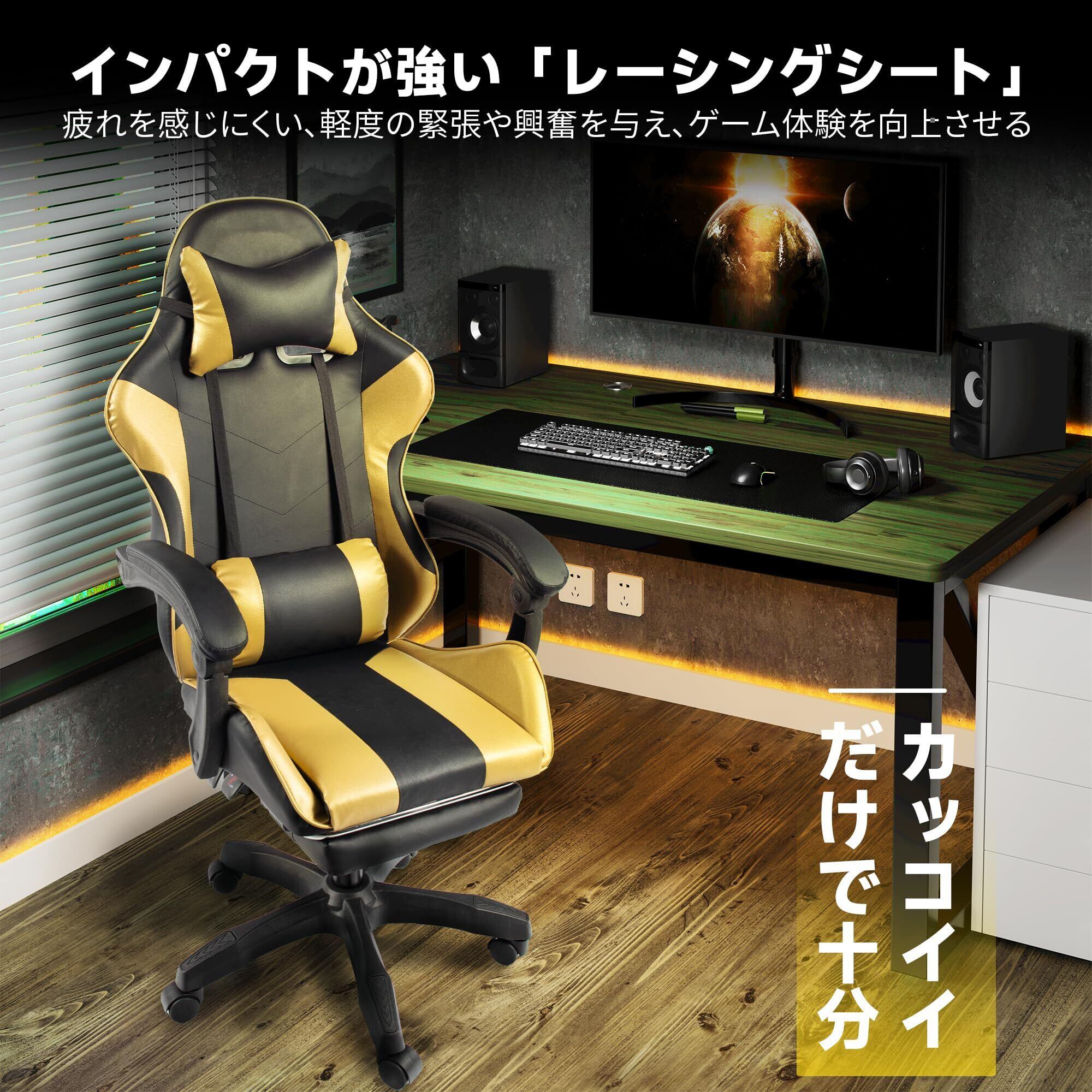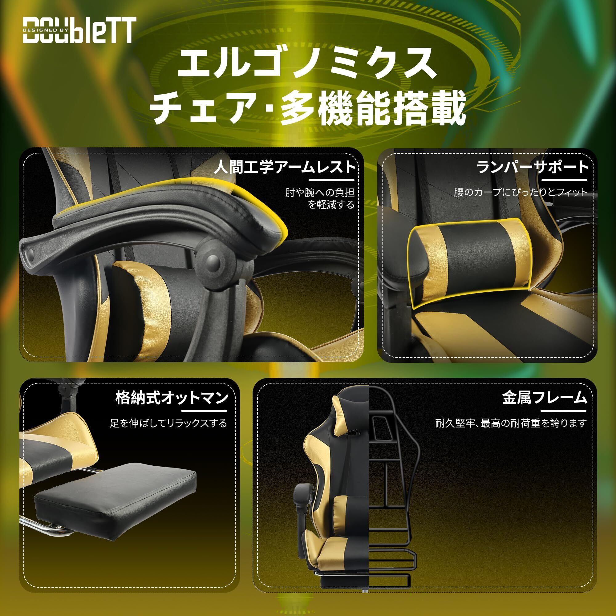 【在庫セール】DoubleTT ゲーミングチェア ゲーム用チェア オフィスチェア デスクチェア パソコンチェア オットマン付き 人間工学 165度リクライニング機能 ハイバック テレワーク椅子 PCチェア (ゴールド)
