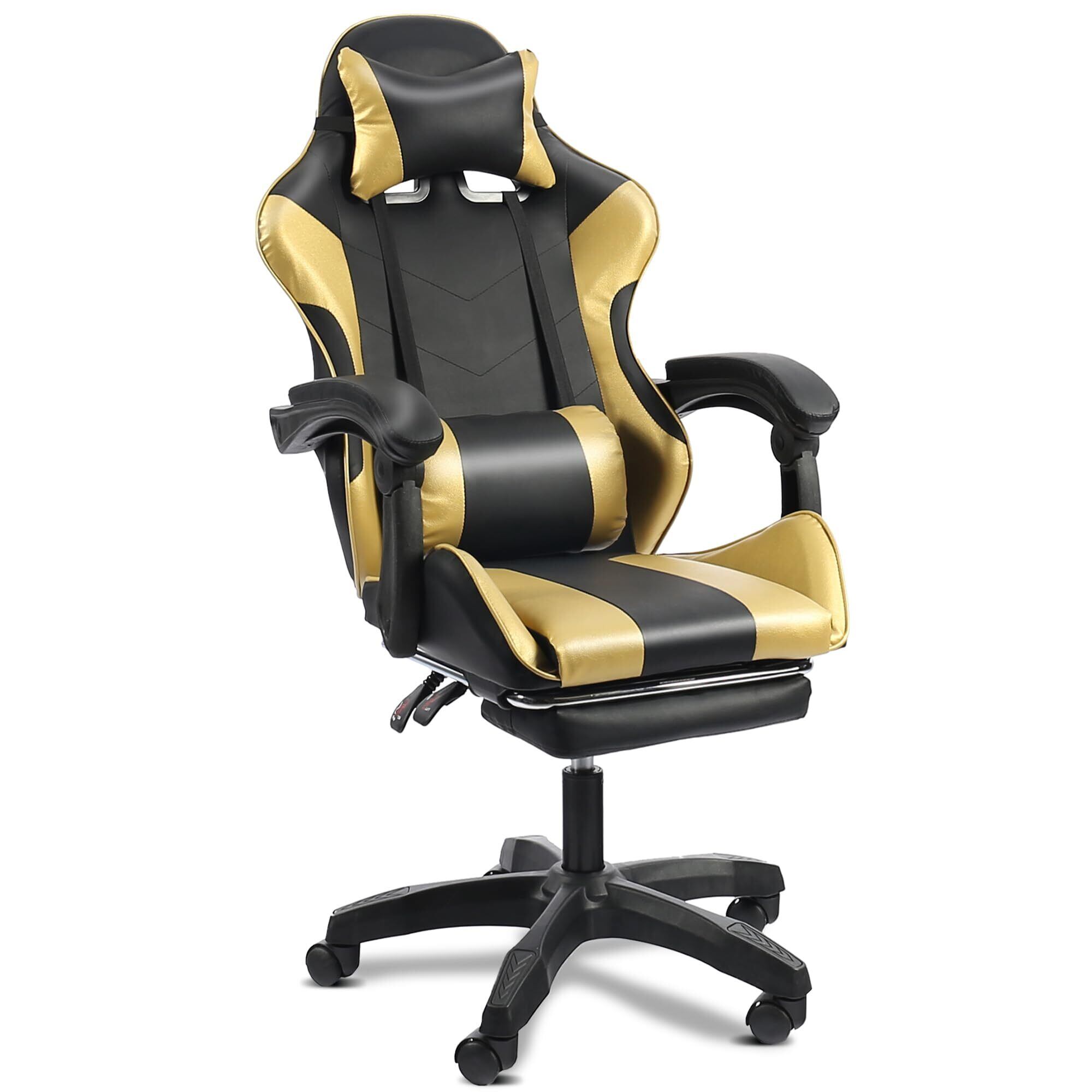 DoubleTT ゲーミングチェア ゲーム用チェア オフィスチェア デスクチェア パソコンチェア オットマン付き 人間工学 165度リクライニング機能 ハイバック テレワーク椅子 PCチェア (ゴールド)