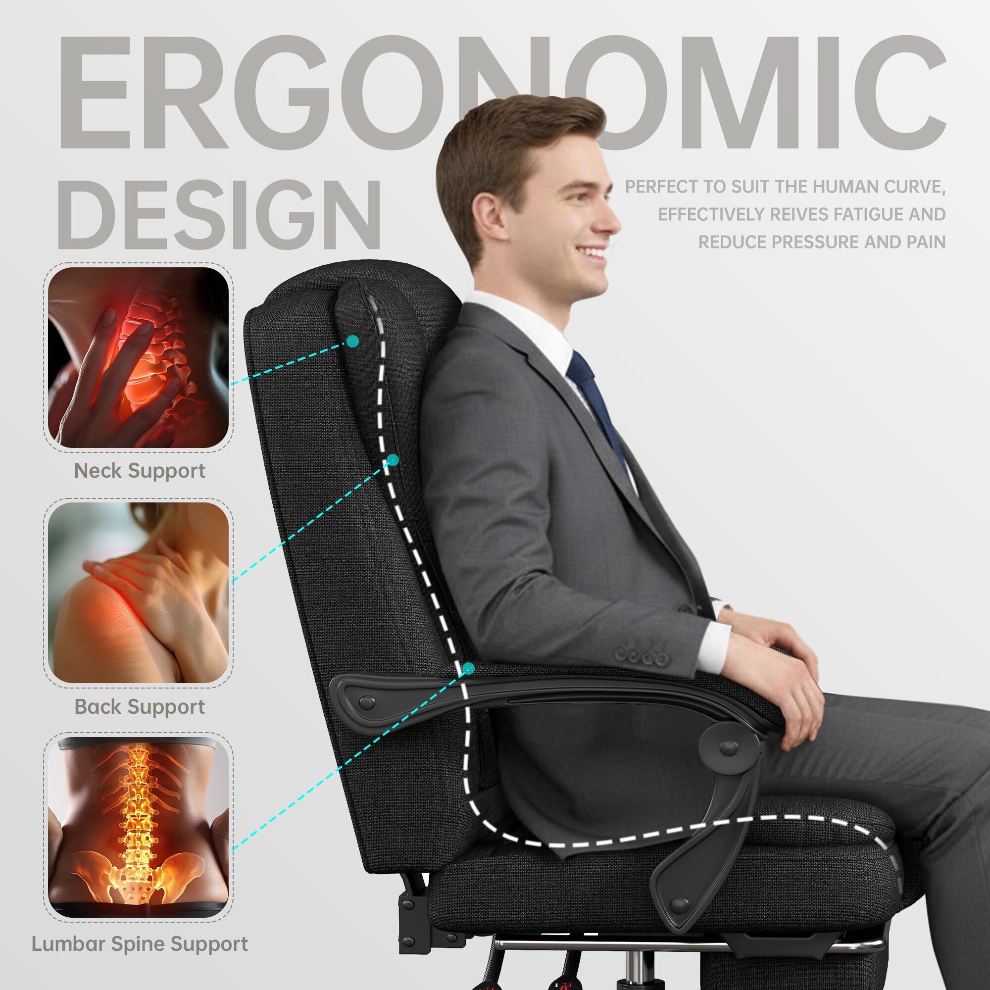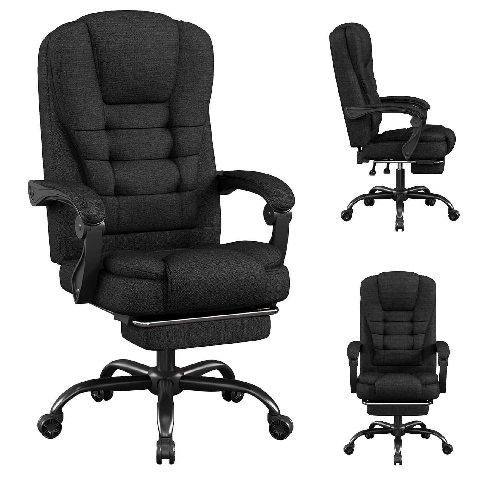 ファブリック製ゲーミングチェア、人間工学デザインのハイバックオフィスチェア、大型エグゼクティブチェア、高さ調節可能・フットレスト&ランバーサポート付き、360度回転・跳ね上げ式アームレスト、大人用,ブラック
