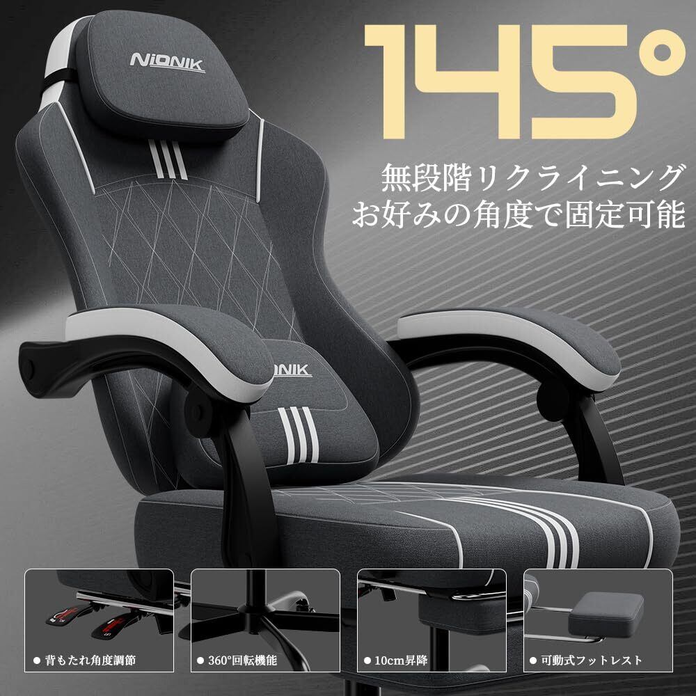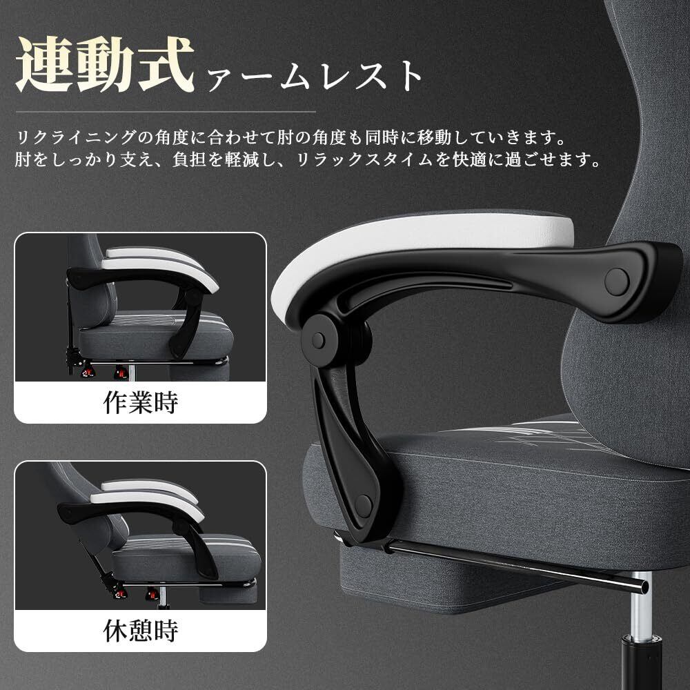 ゲーミングチェア ファブリック オットマン付き オフィスチェア デスクチェア 通気性 テレワーク 疲れない 椅子 人間工学設計 連動式アームレスト 145°リクライニング パソコンチェア 幅広座面 座り心地よい 高耐久性 ゲーム用チェア ヘッドレスト&ランバーサポート 簡単組み立て (グレー)