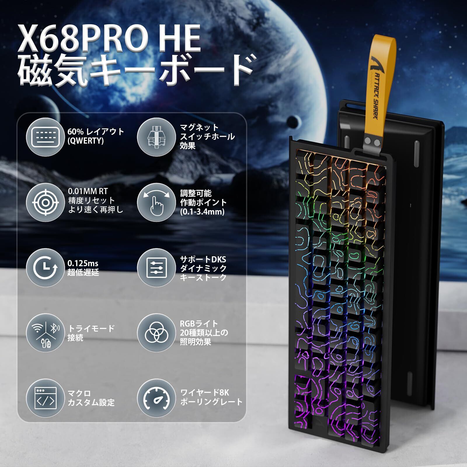 【ラピッドトリガー搭載のX68HEPRO】 ATTACK SHARK X68HEPROは、ラピッドトリガーを搭載のアクチュエーションポイント最大0.01mmに調整可能な超精密なホールエフェクトキーボードです。打鍵音が心地良いMagnetic platinum スイッチ搭載採用した65サイズの68キーのゲーミングキーボードです。FPSや音楽ゲームに最適。より繊細でスピーディーなゲームプレイを実現。 X65PRO HE マグネットキーボード ポーリングレート仕様。