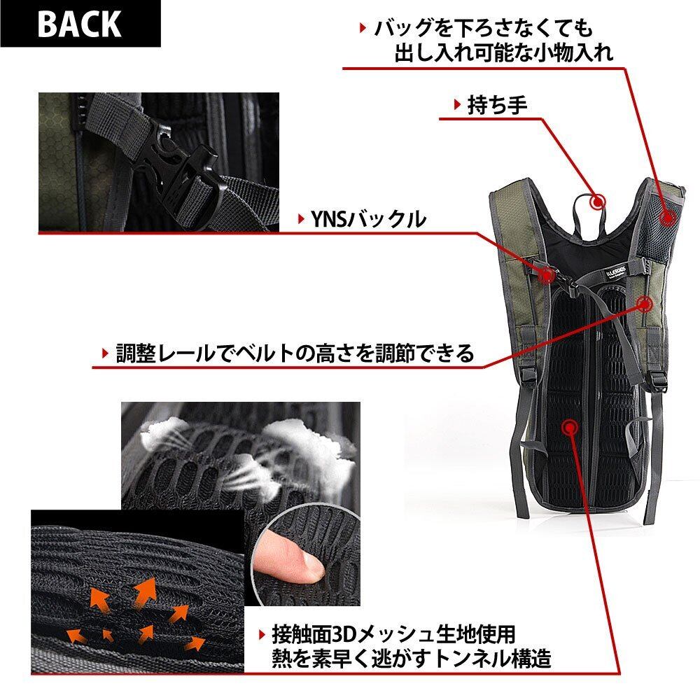 ・内部ポケット: ハイドレーションウォーターパック固定用x1、ミニ傘・懐中電灯用x1