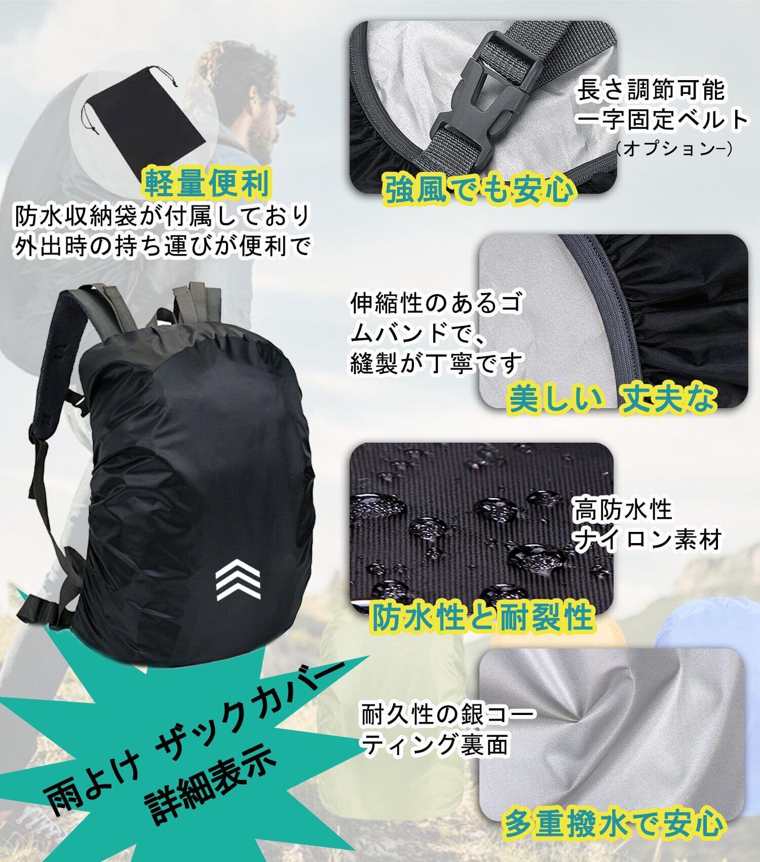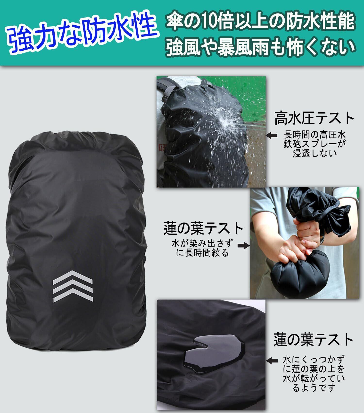 【優れた防水性能】 高品質の防水ナイロン生地と背面内側の銀コーティング加工を採用しており、カバーの防水性能、耐久性、および耐磨耗性が大幅に向上しています。リュック防水カバーとして最大約5000ミリメートルの水圧に耐え、一般的な傘の10倍以上の防水効果を実現。大雨の中でもバックパックをしっかりと保護します!