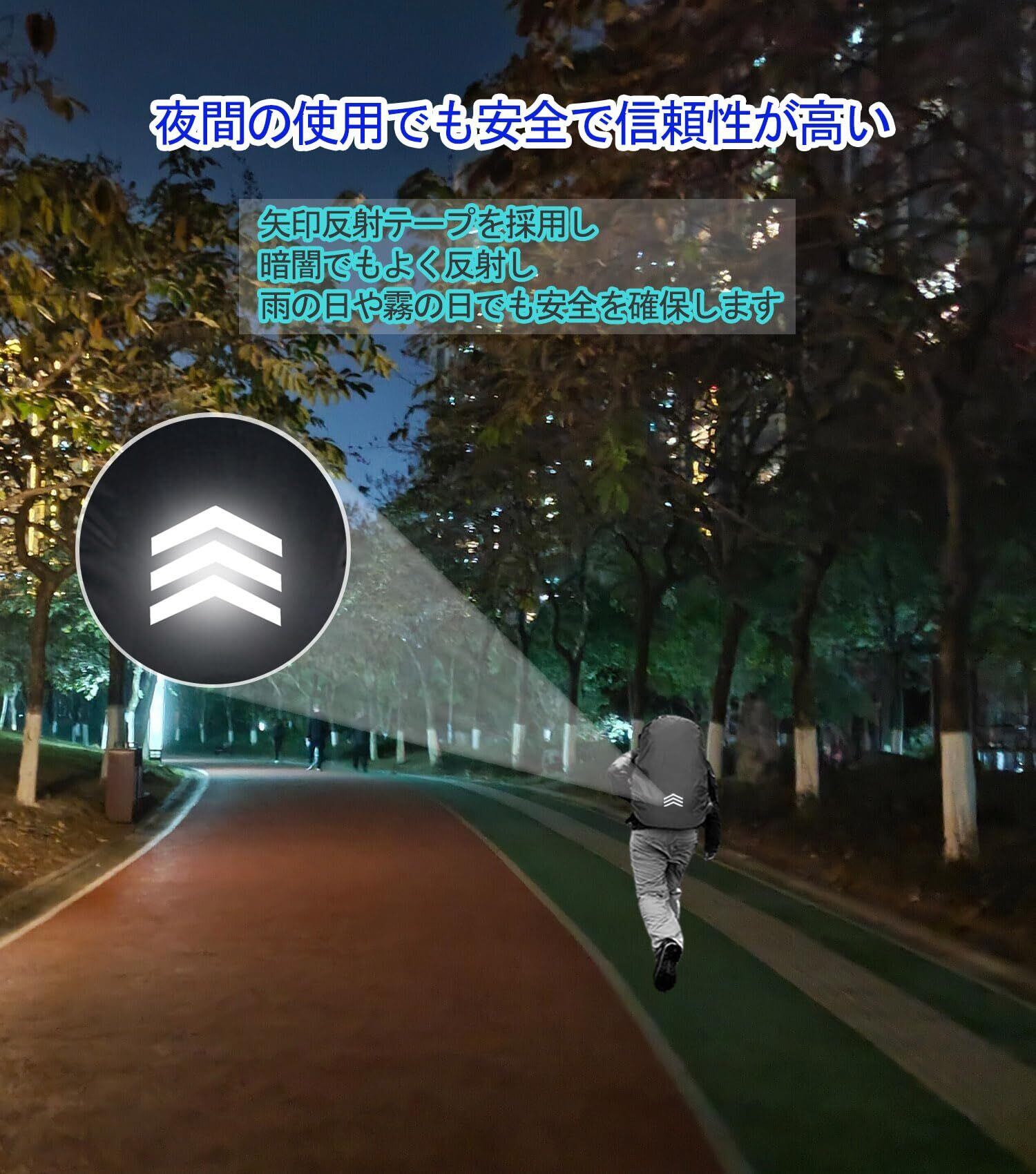 【高輝度反射マークで安全確保】 レインカバー リュックには夜間視認性の高い反射ストリップを採用。アローデザインは、防雨カバーの美観を高めるだけでなく、暗い夜や雨天など視界が悪くなる状況でも周囲の人々からの注目を集めやすくし、交通事故の発生を効果的に抑制します。これにより、あなたのアウトドア活動における安全性を大幅に向上させます。