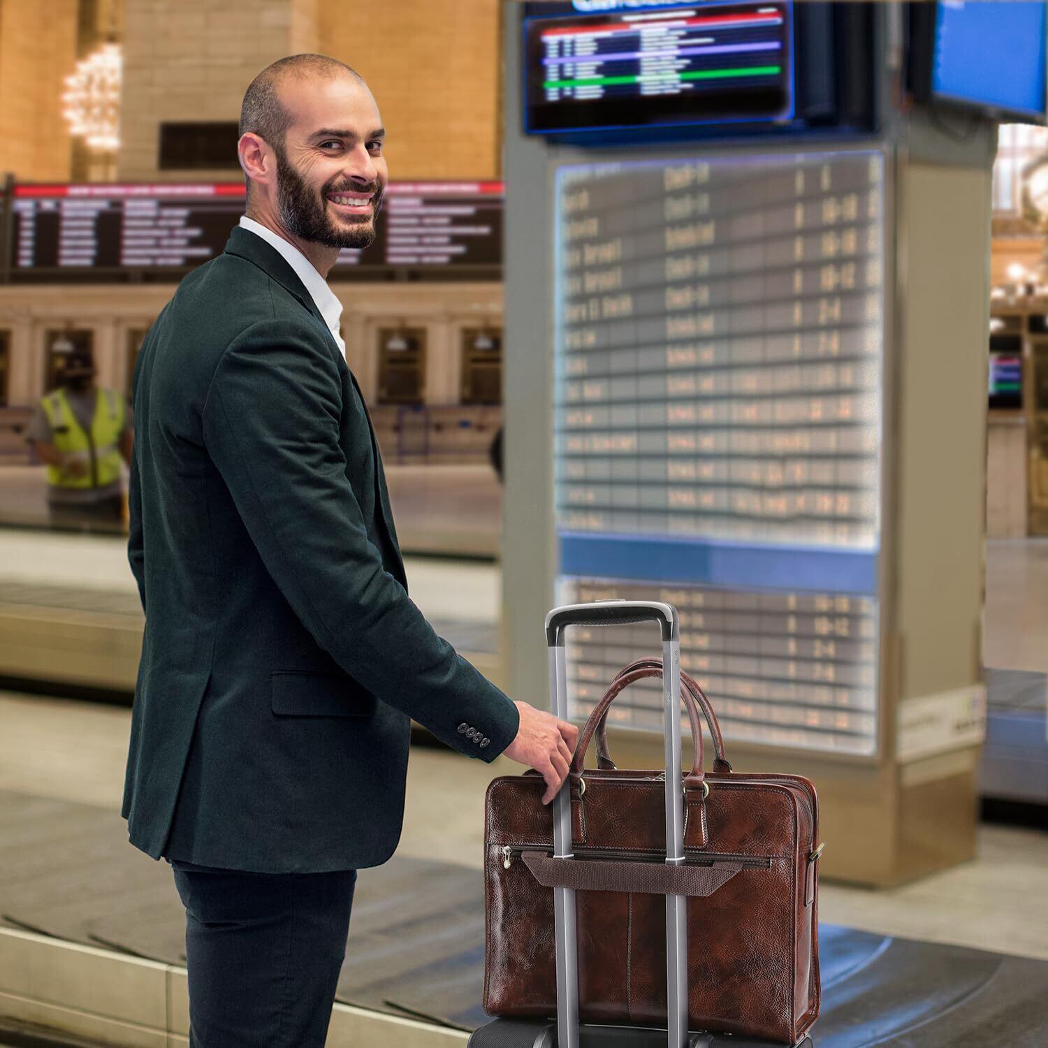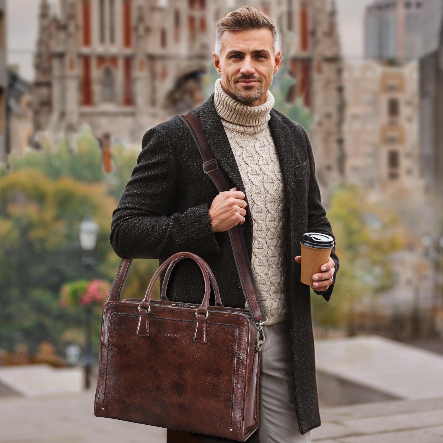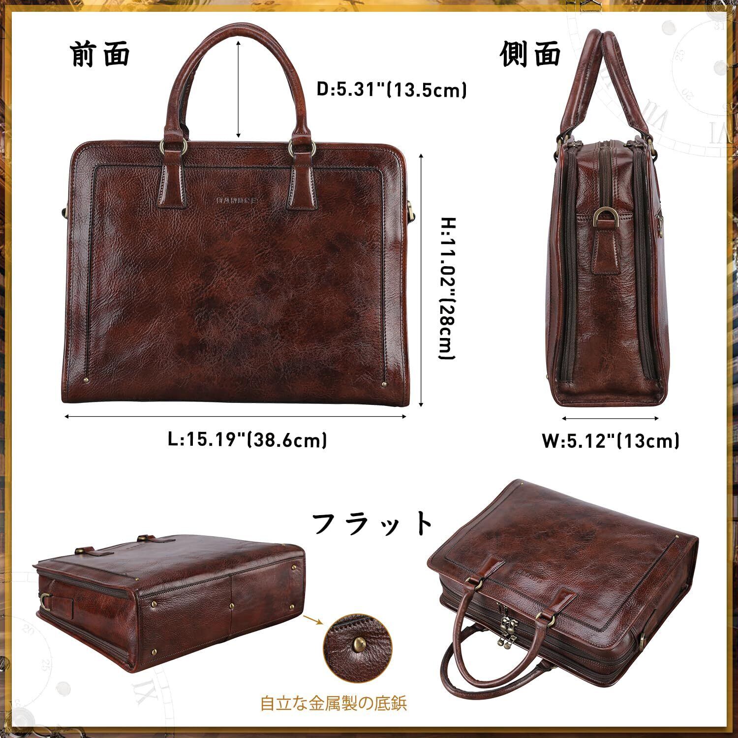 多くの場合の本革メンズビジネスバック:ノートPCやiPadやA4資料や手帳や本やペンや携帯電話やパスや財布や鍵や小物などの収納可能です。キャリ一オン機能付き、自立しやすく、ショルダー ストラップ調節可能、ショルダー ストラップ取り外し可能、出張や就活や通勤やビジネス旅行や便利です。