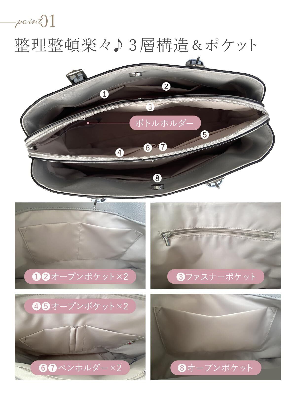 【通勤から就活まで幅広く使えるデザイン】 シンプルで上品なデザインが、ビジネス・就活・フォーマルなどあらゆるシーンに対応。カラーと素材にこだわり、ファッション性と実用性を両立しました。長さの異なる持ち手を2組付属しており、季節や服装に合わせて使い分けできます。 バッグサイズ:高さ27cm/横(下辺)38cm・(上辺)35cm/マチ14cm 重さ:約750g