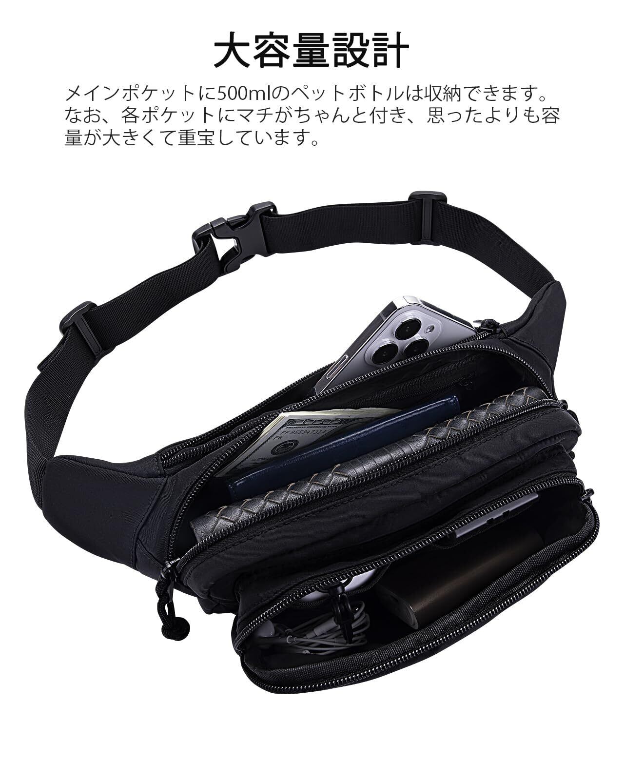 WATERFLY ウエストポーチ ウエストバッグ メンズ 大容量: レディース 仕事用 軽量 多機能 斜めがけ 多ポケット 撥水加工 ペットボトル収納可 男女兼用 2way iPhone 15 Plus/Pro Max対応 アウトドア 登山 散歩 作業用 旅行 スポーツ ウォーキング 自転車 バイク ウォーキングバッグ ヒップバッグ ブラック