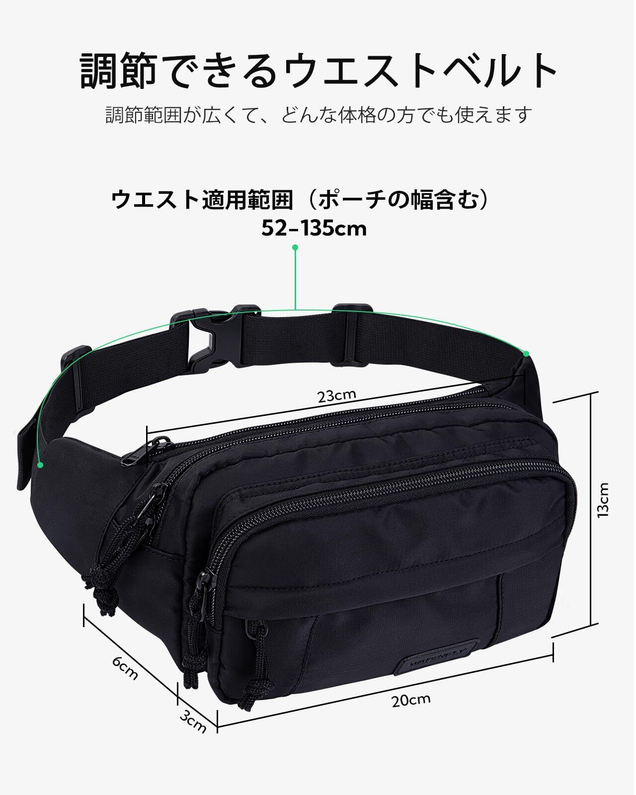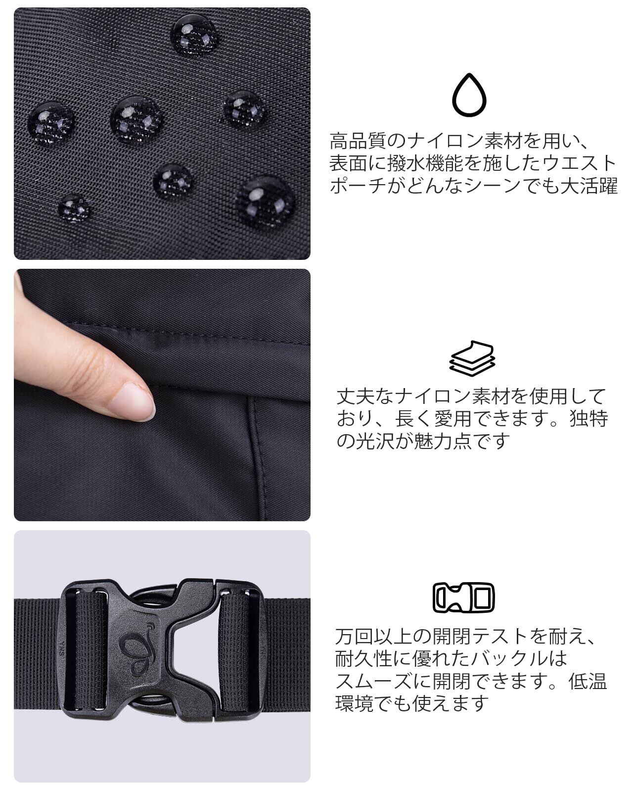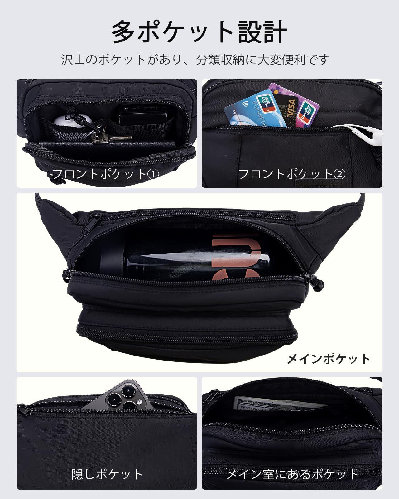 多ポケット設計: 沢山のポケットがあり、分類収納に大変便利なウエストバッグです。メインポケット、フロントポケット*2、隠しポケットなど、ジッパー付きのポケットは五つあります。各種類、各サイズの日常物は使用目的に応じて分別して使用できます