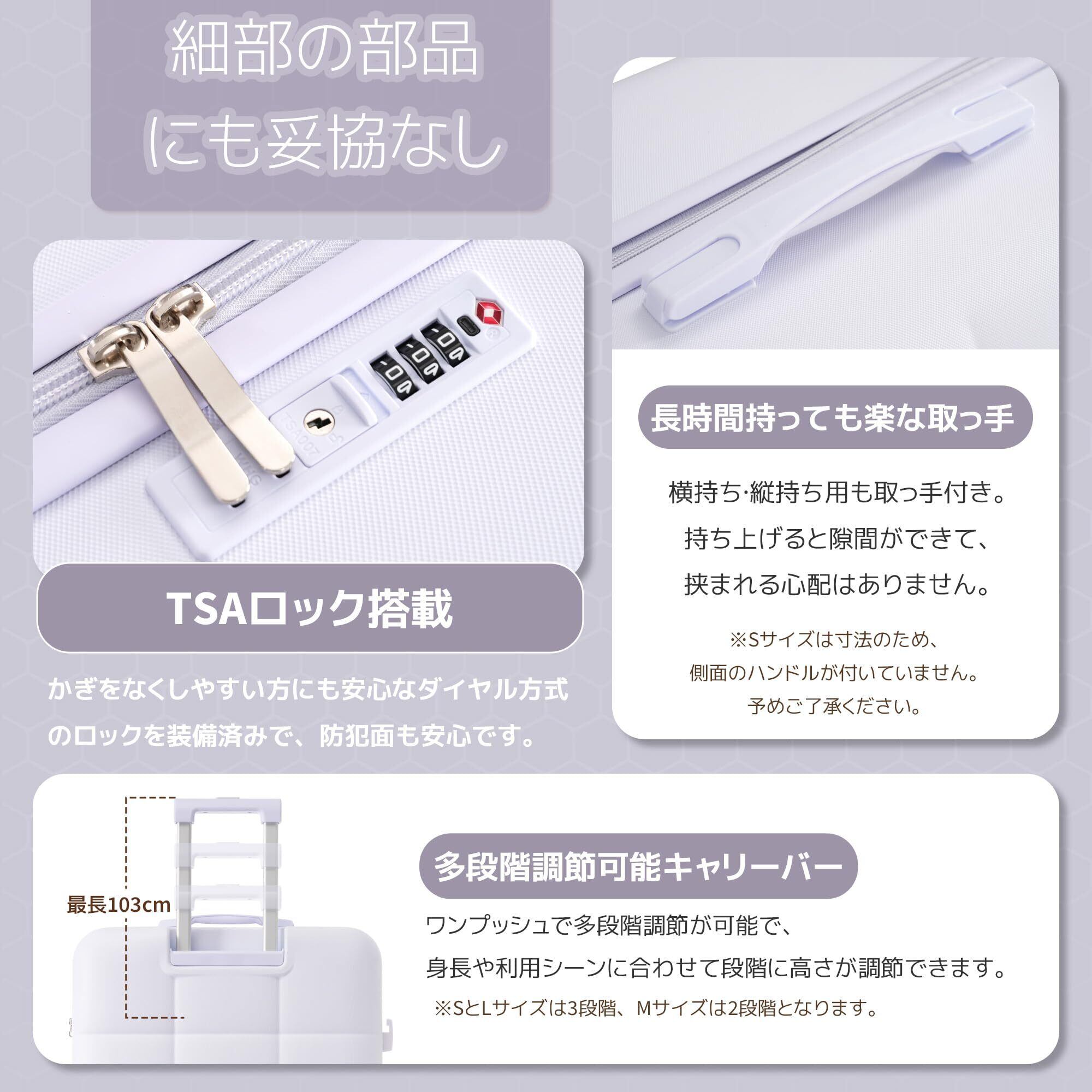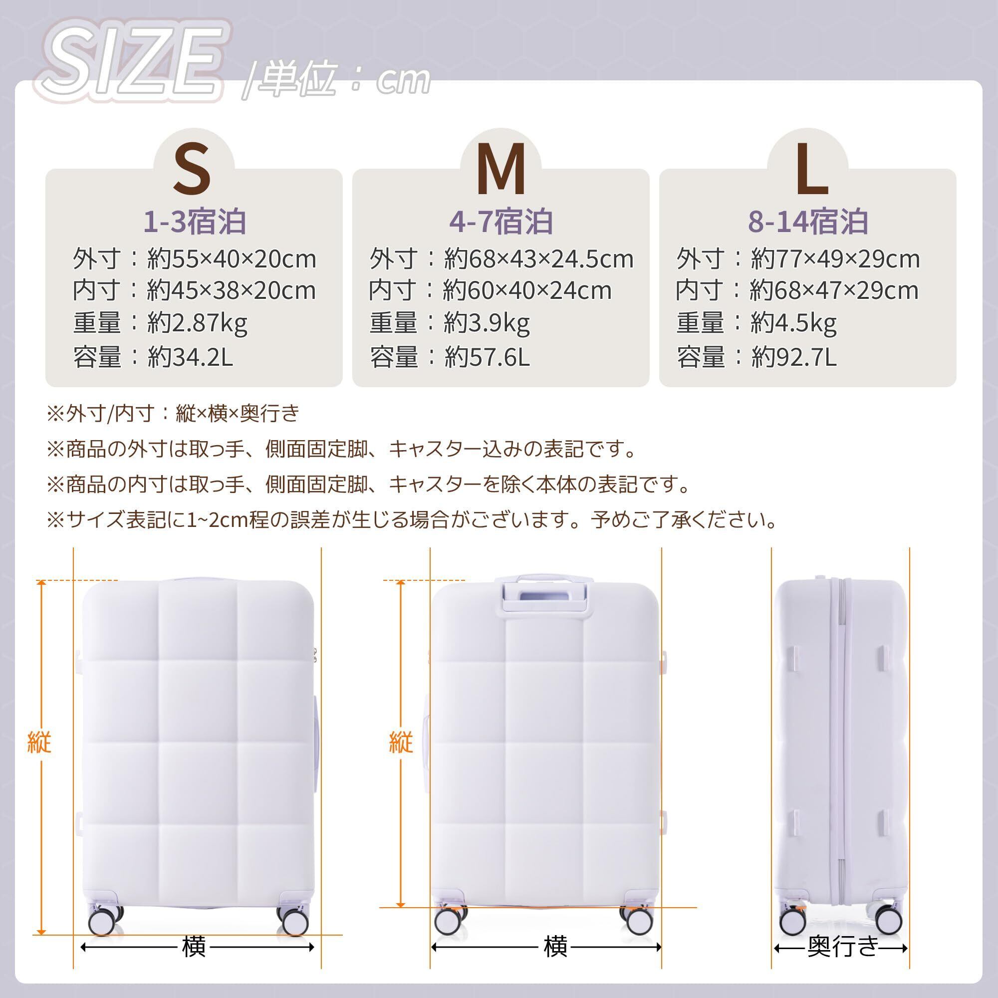 【商品仕様】※S size:外寸:約55×40×20cm 内寸:約45×38×20cm 本体重量:約2.87KG 、1~3泊に似合い。Sサイズは機内持込が可能なスーツケースです。飛行機内だけでなく、一人旅行や故郷帰りの新幹線やバスなどの車内移動も便利なスーツケースです。※M size:外寸:68×43×24.5cm 内寸:約60×40×24.5cm 本体重量:約3.9KG、4-7泊以上 。※L size:外寸:約77×49×29cm 内寸:約68×47×29cm 本体重量:約4.5KG、7泊以上。