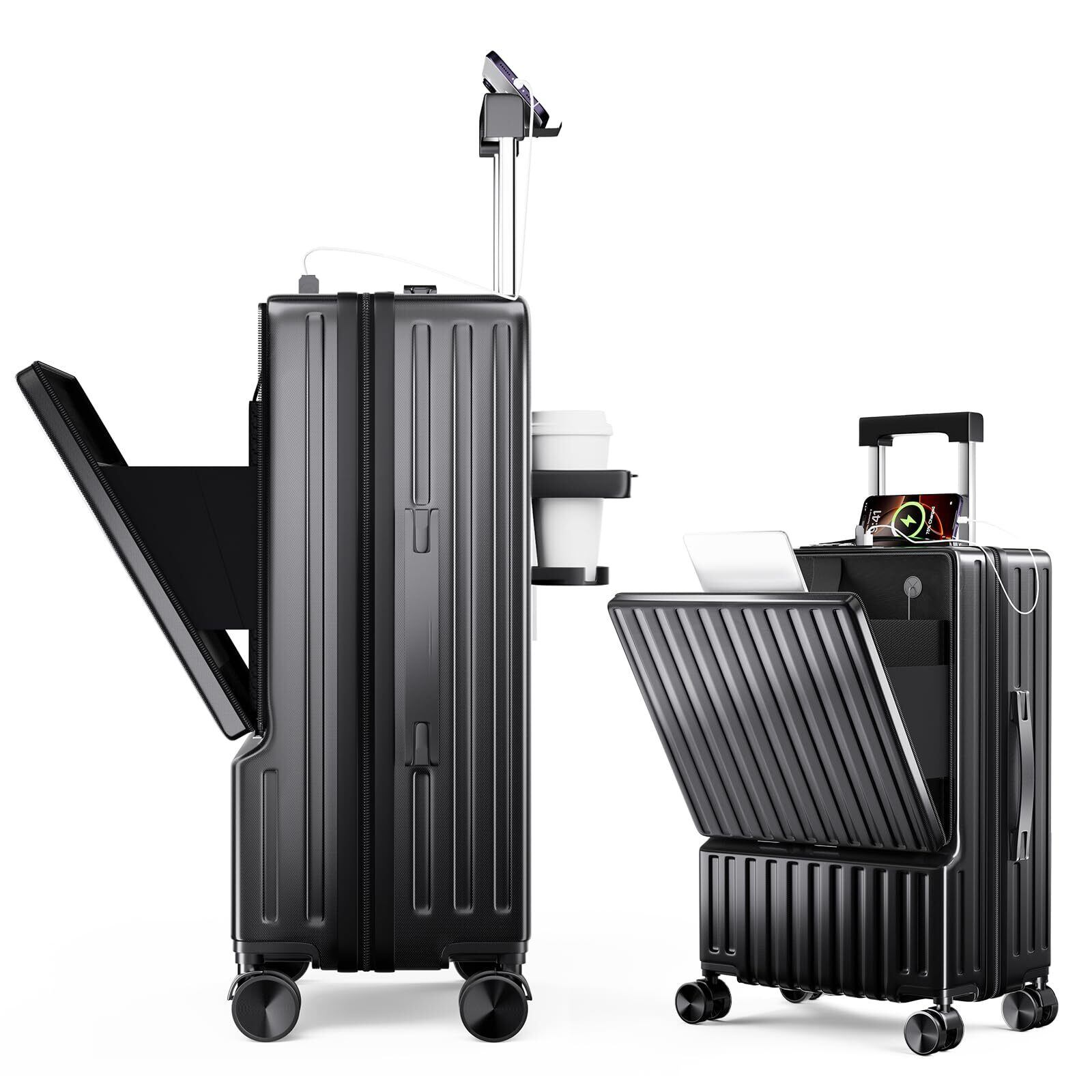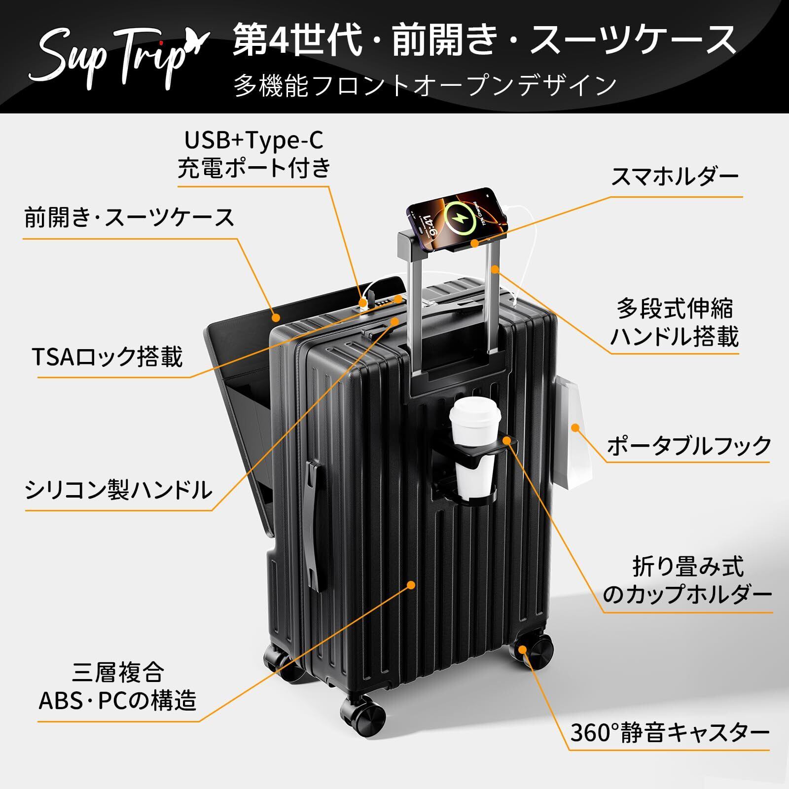 [SupTrip] スーツケース フロントオープン 多機能 キャリーケース 機内持ち込み 軽量 カップホルダー付き 隠しフック機能 キャリーバッグ USB+Type C充電機能 携帯スタンド TSAロック搭載 耐衝撃 静音 360度回転 キャリーバッグ 人気 おしゃれ 旅行 ビジネス 出張 修学 泊まる 入院 (ブラック, M (4~7泊/60L))