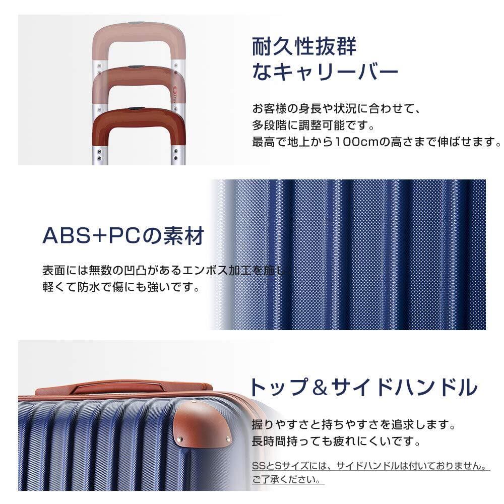 軽量なので重さ制限に有利で、女性の方でも軽々と持ち上げることができます。【TSAロック】海外旅行には欠かせない世界基準のダイヤル方式のTSAロックを採用しています、国内外にも関わらず、航空便をご利用する際に便利で、より安全で便利です。※ご注意:鍵は付いておりません。予めご了承ください。ご注意!!:SS、S、容量UP--SSと容量UP-Sサイズは寸法のため、側面のハンドルと底足が付いていません。そして、コーナープロテクトが二箇所しか装備しないです。
