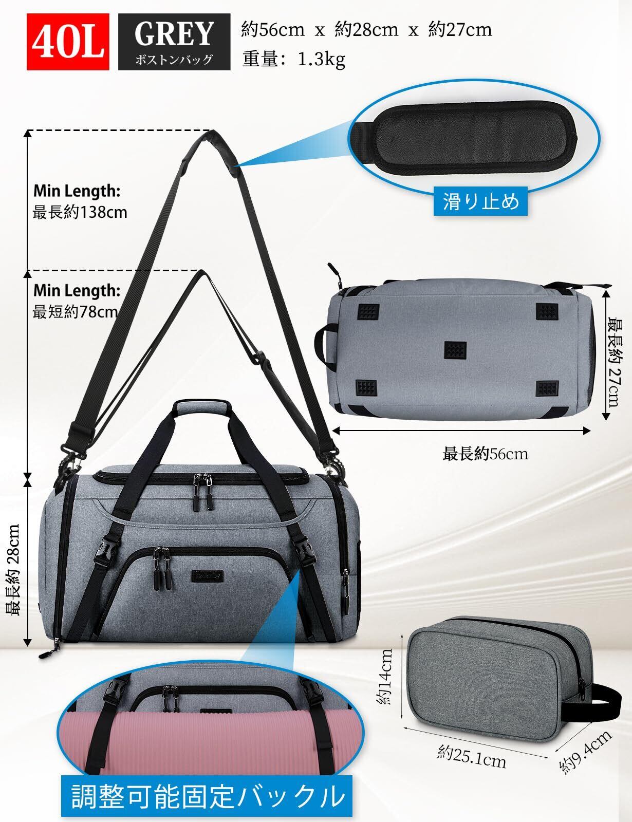 スポーツバッグ メンズ ボストンバッグ 大容量 修学旅行 旅行バッグ YKKファスナー 撥水加工 乾湿分離 ジムバッグ 40L 55L シューズ収納 斜めがけ 手提げ 肩掛け 男女兼用 gray-40L