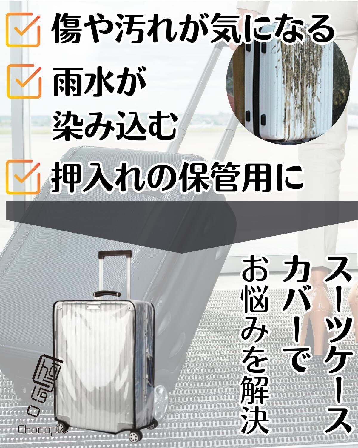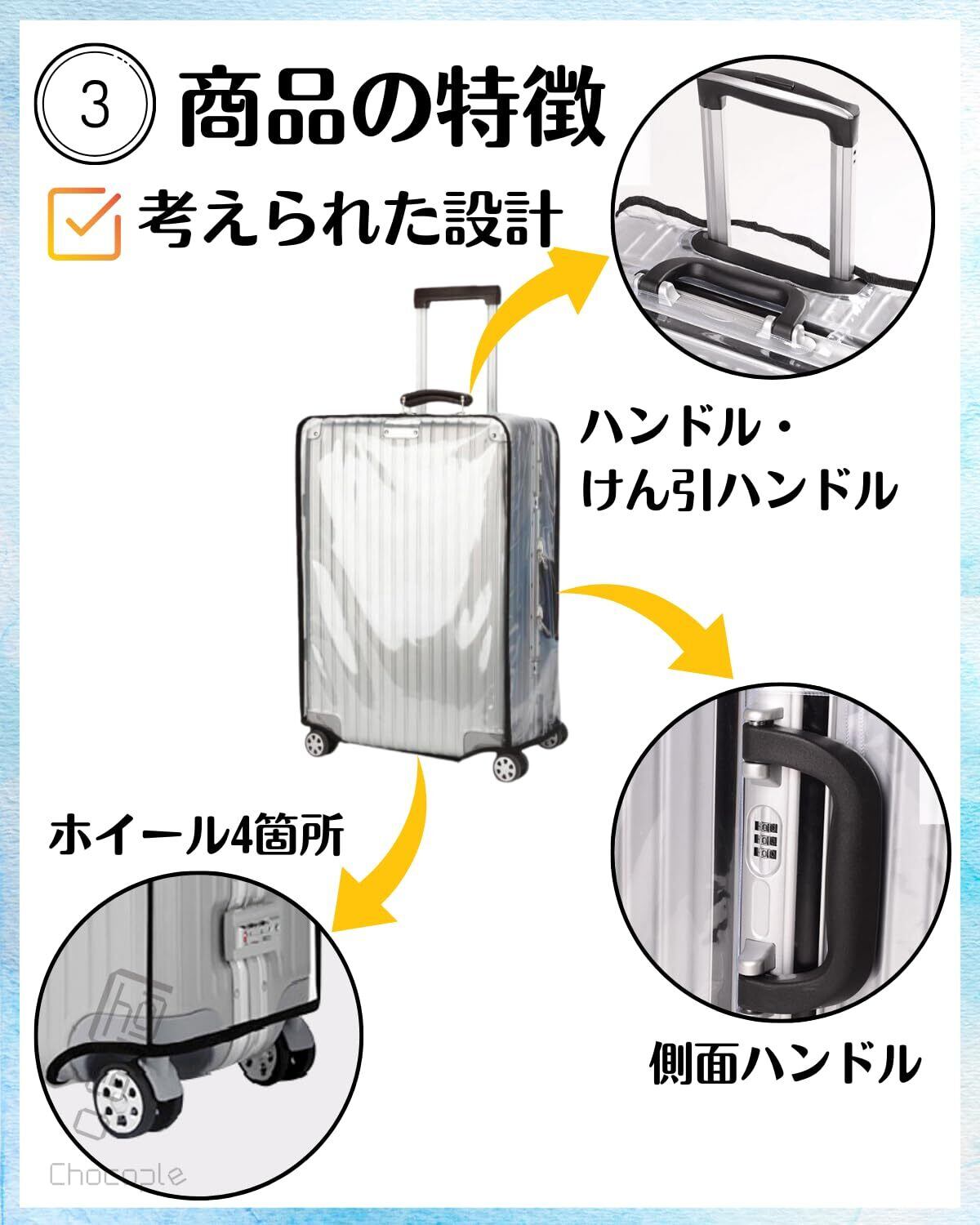 【傷や汚れ、雨水の対策に】スーツケースやキャリーバッグの傷や汚れ、雨の日の対策として効果的なスーツケースカバーです。【簡単取り付け】スーツケースに被せるだけの簡単設置です。底にマジックテープを貼り付けるだけです。【ハンドル部分は貫通穴有り】上部のハンドル、けん引ハンドル、側面ハンドルは貫通穴があります。【商品詳細】材質:PVC(ポリ塩化ビニル)、サイズ:画像参照(20インチから30インチ)、厚さ0.6mm【安心の30日間】商品品質には万全を機しておりますが、万が一初期不良等発生した場合はご購入から30日間に限り新しい商品と交換対応いたします。Chocopleオリジナル梱包にて倉庫から迅速にお届けいたします。