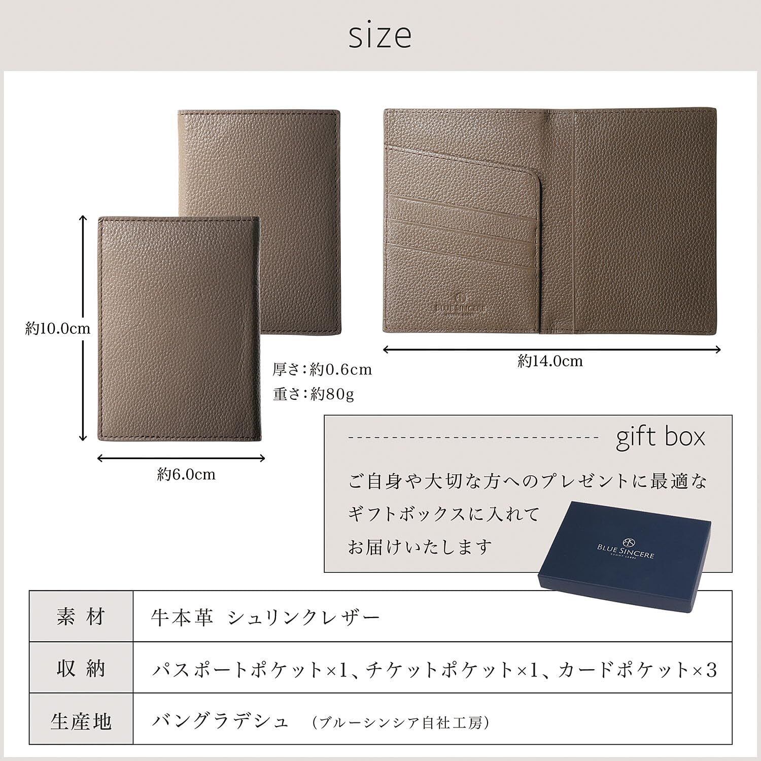 【 ブルーシンシアとは? 】 「ブランドの発展とともに、バングラデシュの社会問題を解決する」という理念を掲げ、 バッグや財布を自社工場のバングラデシュの職人たちと、その土地の素材の可能性を追求し、 先進国でも通用する高機能なプロダクトを生産しています。 【洗練された薄型二つ折りデザイン】シンプルで上品な外装に、自然皮革ならではの柔らかな質感と使うほどに深みを増す色合いが際立つパスポートケースは、旅先でのスタイルをさりげなく格上げしてくれる存在。内装には左側に3つのゆとりあるカードポケットと航空券などを収納できる幅広のフリーポケット、右側にはパスポートホルダーを備え、必要なものをスマートにまとめられる設計。大人の旅を快適にサポートし、上質なひとときをより豊かに彩る特別なパスポートケースです。