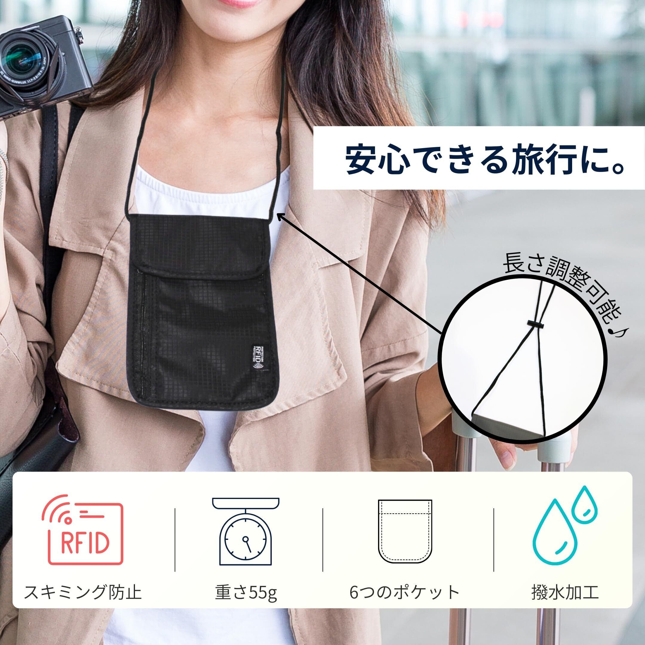 【安心のセキュリティ&収納力】高性能スキミング防止加工を施したナイロンファイバー素材で、個人情報を徹底ガード。6つのポケットで使い勝手抜群、パスポートや現金、カード類をしっかり収納。撥水加工の軽量生地(わずか55g)は、雨の日でも安心の防水仕様。0.5cmの超薄型デザインで、服の下に隠して持ち歩きやすく、旅行時のセキュリティ対策も万全です。長さ調節可能なショルダーストラップで、首掛けや斜め掛けも自由自在。安心して旅行ができるようお手伝いします。