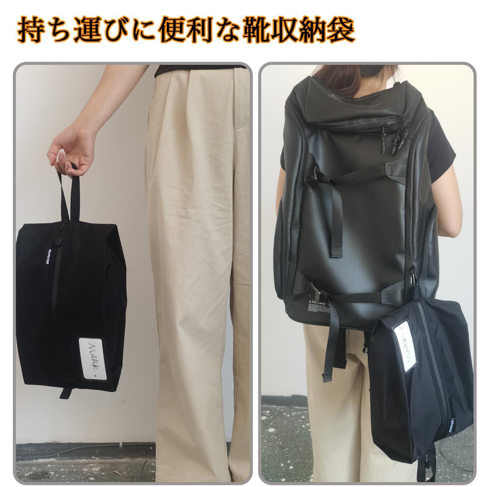【特価商品】FLYFLYGO シューズケース シューズバッグ 防水防塵 軽量 男女兼用 アウトドア スポーツ 旅行 出張 革靴収納 上履き袋 防臭防汚 携帯便利 卓球 バスケット ゴルフ 部活 学生用 (ブラック, M)