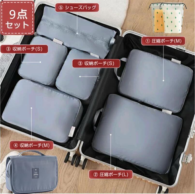 トラベルポーチ 圧縮 9点セット 旅行用ポーチ スペース節約50% 【2025新設計】旅行用圧縮袋 便利旅行圧縮バッグ パッキングポーチ 洗面用具 旅行用 撥水加工 衣類仕分け 温泉 出張 海外 修学旅行 靴用 下着収納 (グレー)