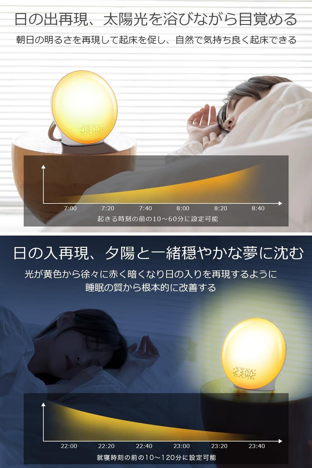 ▶【日の出・日没シミュレーション&Bluetooth音楽機能】 光目覚まし時計を一台置くだけで、朝の目覚めが変わります。暗い冬の朝でも日の出ライトモードが太陽のような光を再現し、自然に目が覚めます。フルスクリーン仕様で部屋全体を明るく照らし、心地よい一日をスタート。夜は日没ライトモードを使えば徐々に暗くなり、リラックスして眠りにつけます。(※点灯時間は起床の10~60分前または就寝の10~120分前に設定可) Bluetooth機能付きで、スマホなどのBluetooth対応機器と接続し、好きな音楽を再生できます。