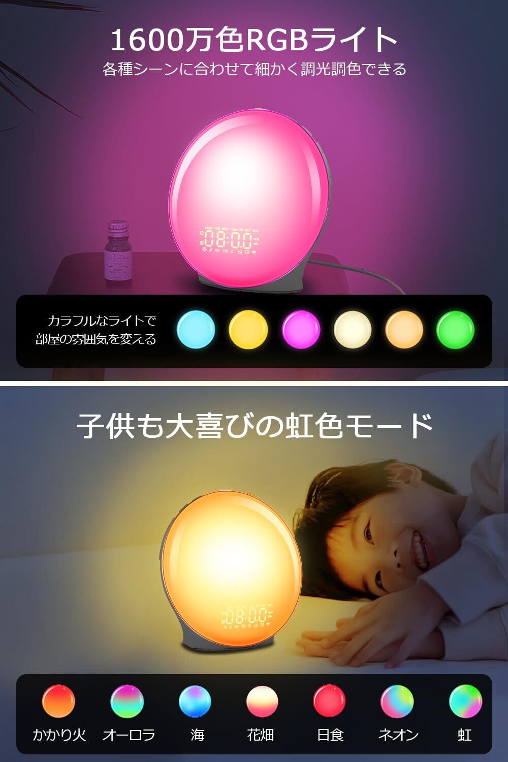 目覚まし時計 光 目覚ましライト 【Bluetooth音楽・休日/平日アラーム設定】 めざまし時計 大音量 日の出&日没シミュレーション搭載 8種類自然音・20段階明るさ調整・16段階音量調節 光で起きる 置きどけい RGB/虹色ライト 光目覚ましどけい スヌーズ&FMラジオ機能付き 明るさ調整可 フルスクリーン照明 ベッドサイドランプ 授乳 寝室・子供部屋