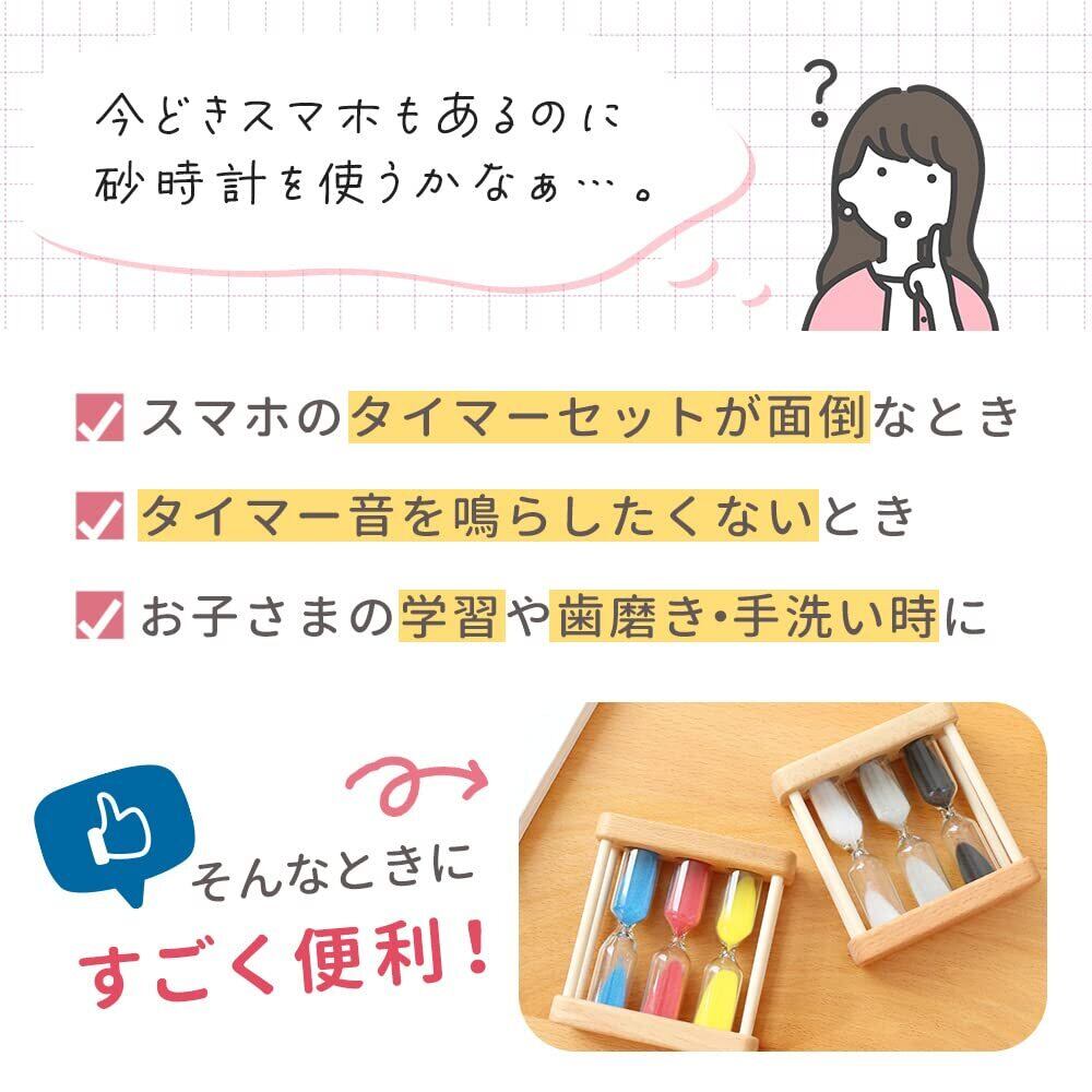 【1分・3分・5分が一度に計れる便利な砂時計】 3種類の時間が同時に計測できるので、料理やコーヒーの蒸らし、筋トレのインターバルやストレッチ、勉強時間の管理、歯磨きや手洗い習慣など、日常のさまざまなシーンで活躍。スマホのタイマーを使わず、シンプルな方法で時間を管理できるアナログな砂時計。お子様の時間感覚を養うツールとしてもおすすめのアイテム。