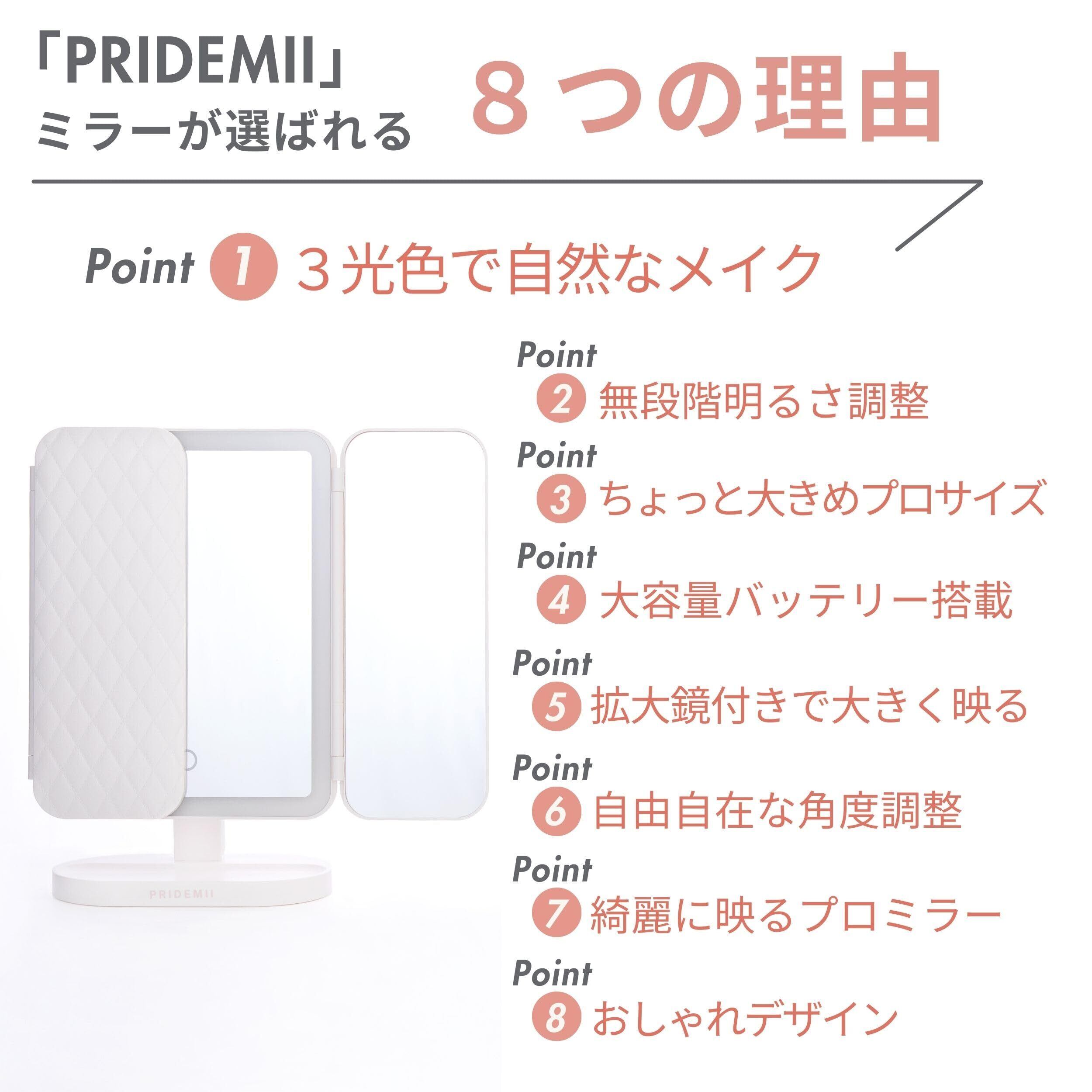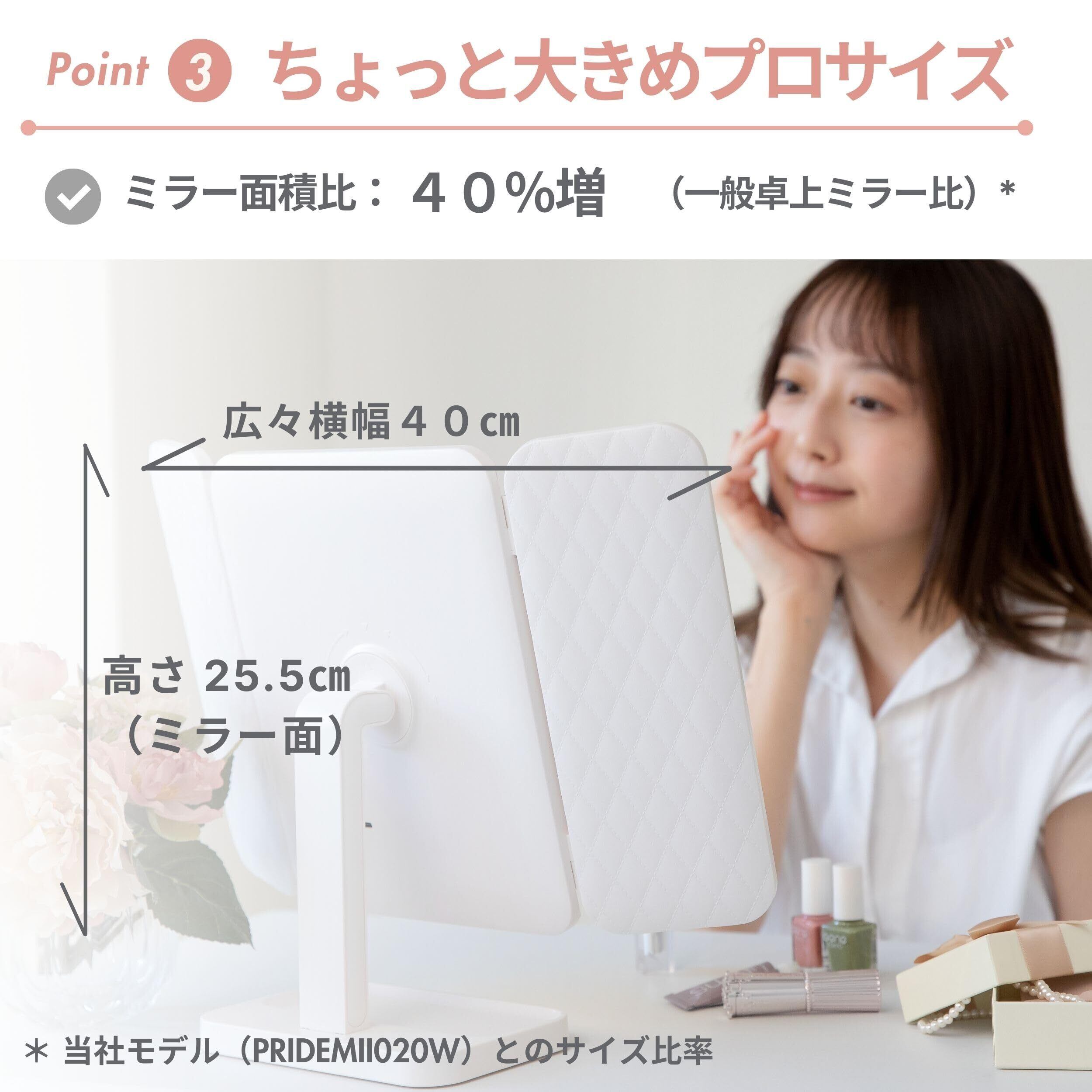 【かわいい・多機能】ミラーの全面をレザー調のデザインと、おしゃれでかわいい外観としました。明るさ無段階調光 3光色(昼光食/昼白色/電球色)、リチウムイオンバッテリー、3種類の拡大率(1/2/3倍)など、卓上ミラーを楽しくご利用頂ける機能を搭載しました。