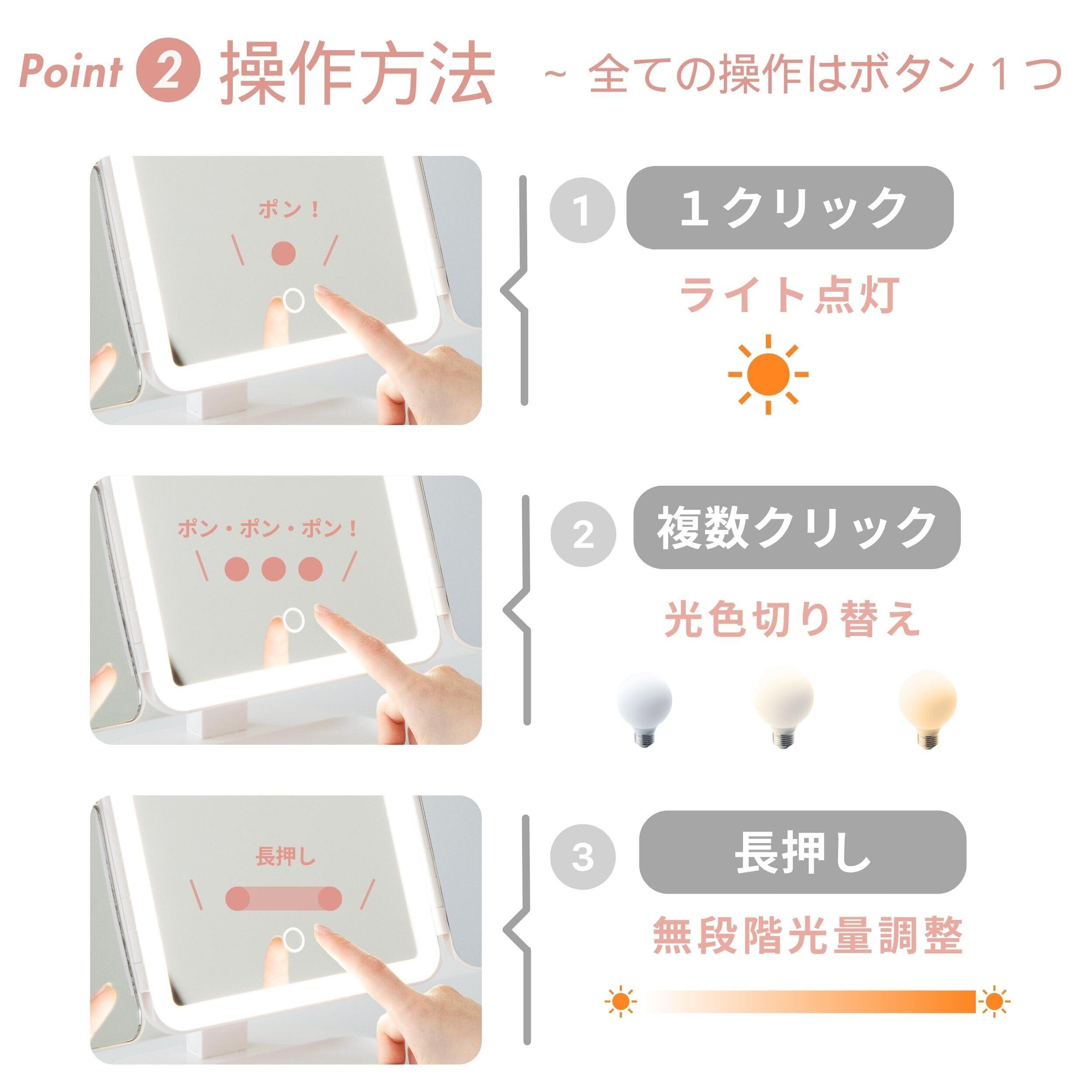 【明るさ抜群】ミラーの周りに70個のLEDライトを配置し、暗い部屋でもお顔を明るく照らすことが可能です。ミラー面のタッチパネルで、光色の切り替え(昼光食/昼白色/電球色)、明るさの無段階調整が可能です。