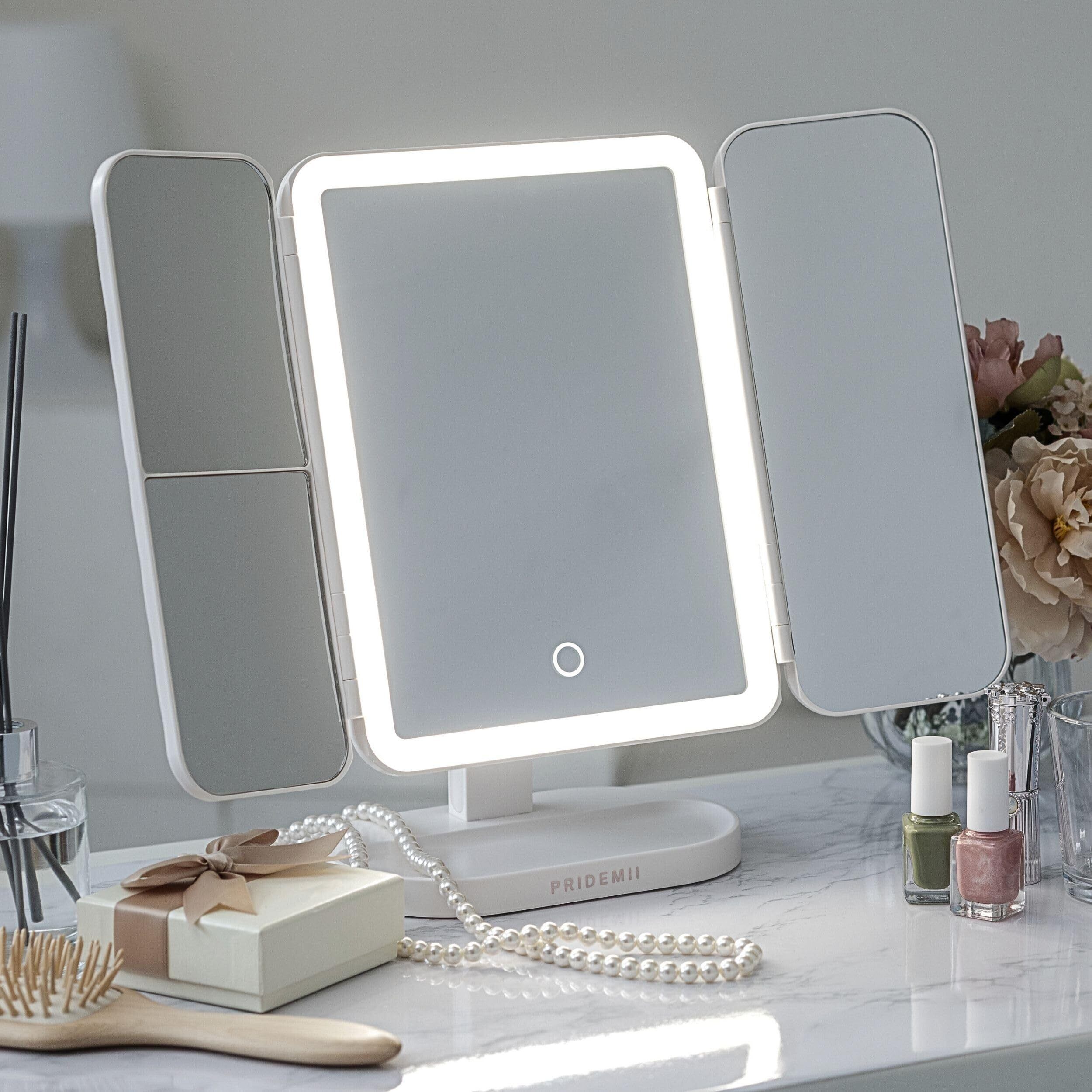 女優ミラー ちょっと大きめ 【バッテリー内蔵・かわいい・多機能】 LEDライト 明るさ無段階調光 3光色切替 拡大鏡付き USBタイプC充電 レザー調デザイン 化粧鏡 卓上ミラー 三面鏡 (オフホワイト)
