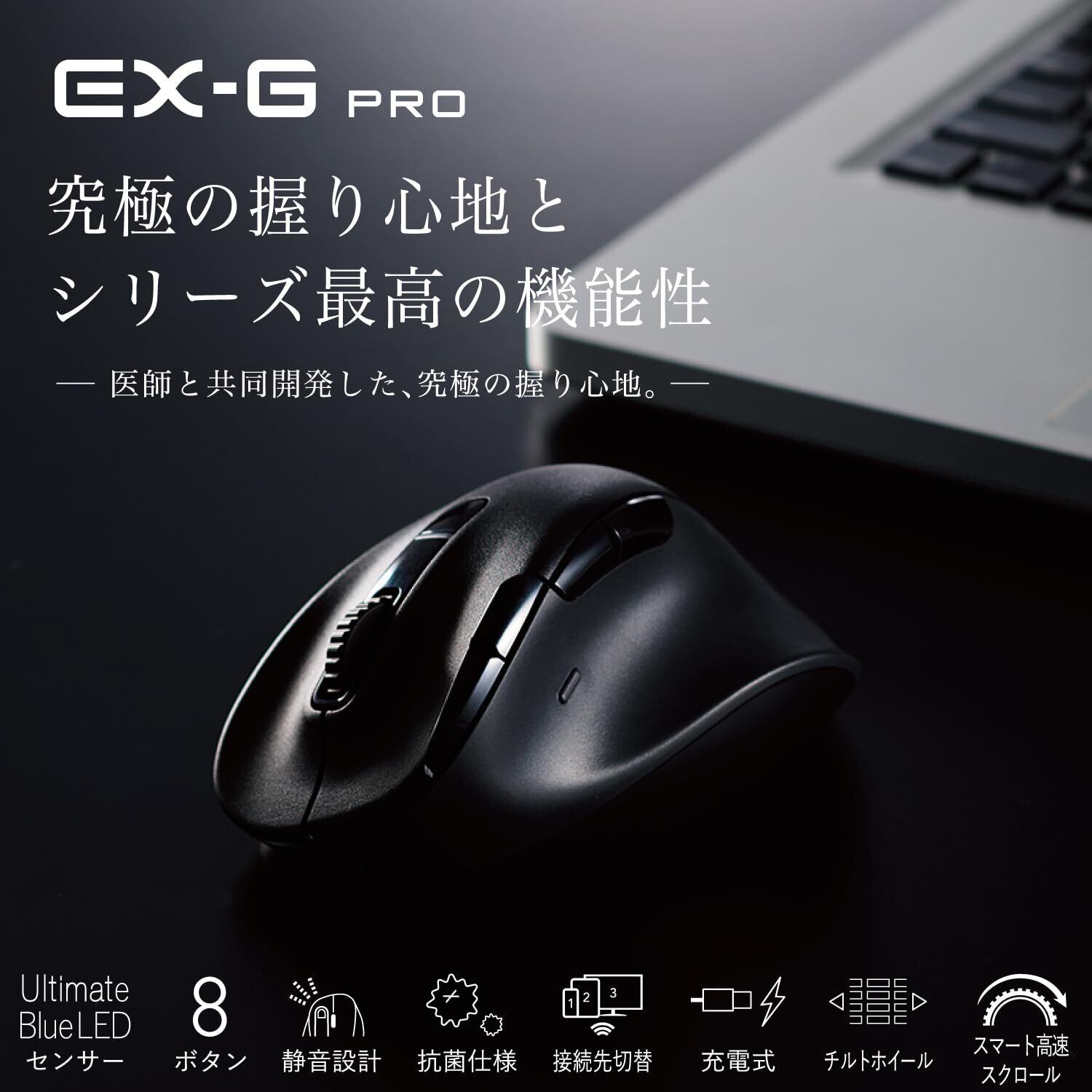 医師と共同開発した究極の握り心地とシリーズ最高の機能性を実現した8ボタンマウス"EX-G PRO"。