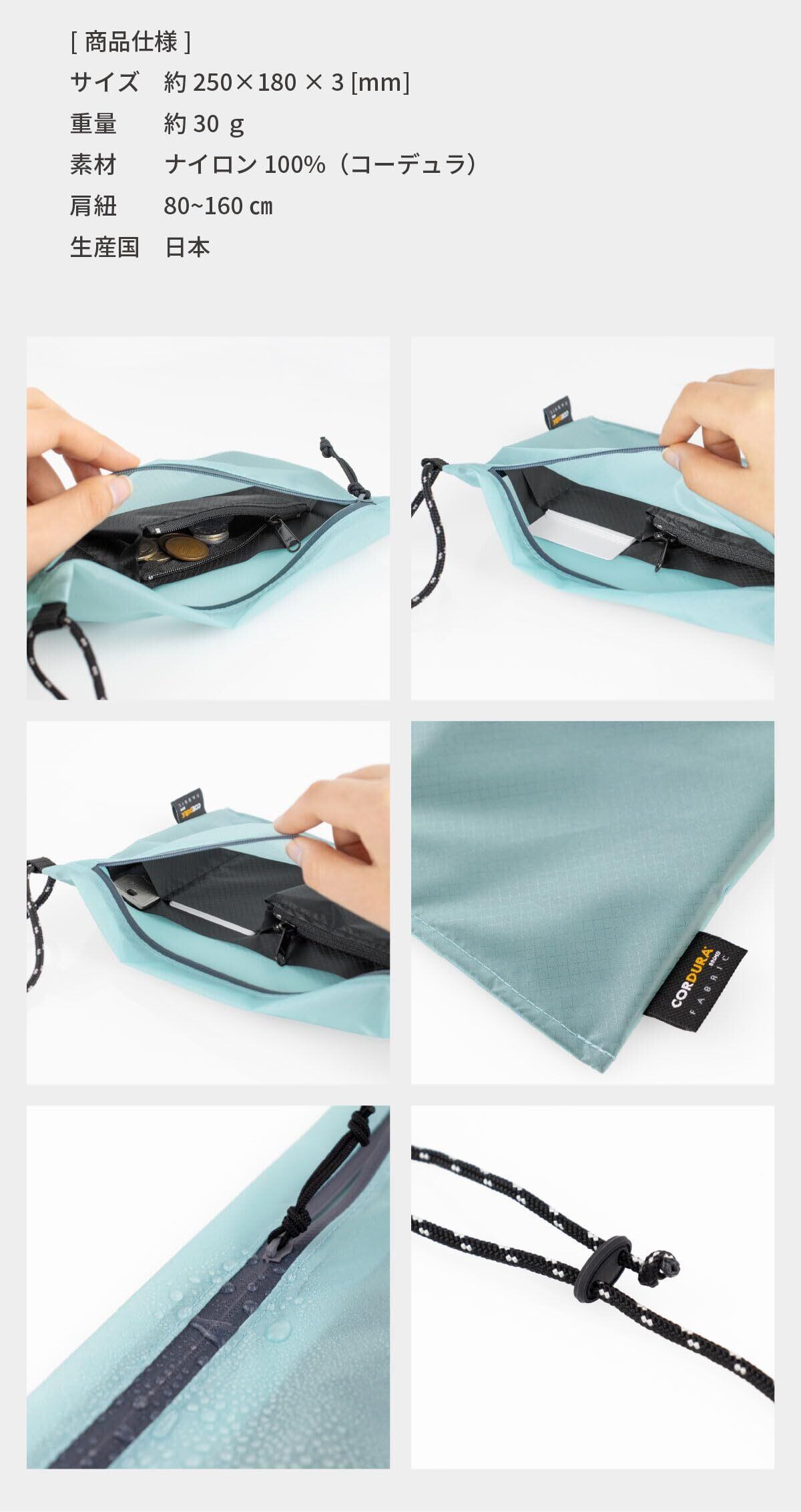 クロワッサンより軽い30gのバッグ- 極薄の生地を使用し、極限まで軽量化された約30gのサコッシュ。持っていることを忘れるほど身軽な、お出かけを体験しよう。