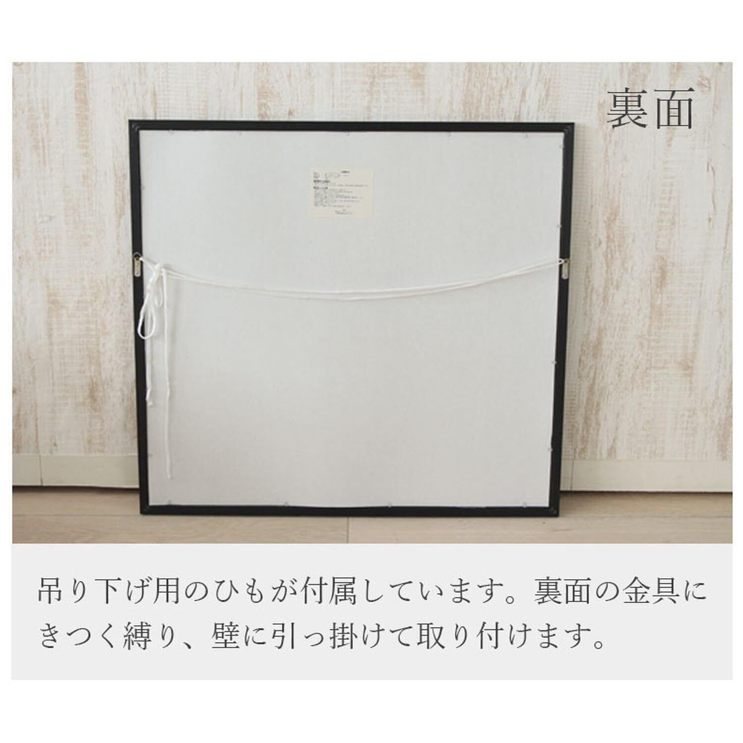 本体サイズは幅75cm高さ65cm重量約3.8kg。四角のミラーで気軽に設置でき、リビング、ベッドルーム、玄関などに掛けるだけでモダンな印象を与えます。コンクリートやレンガ調の壁などのアクセントクロスにもぴったりです。