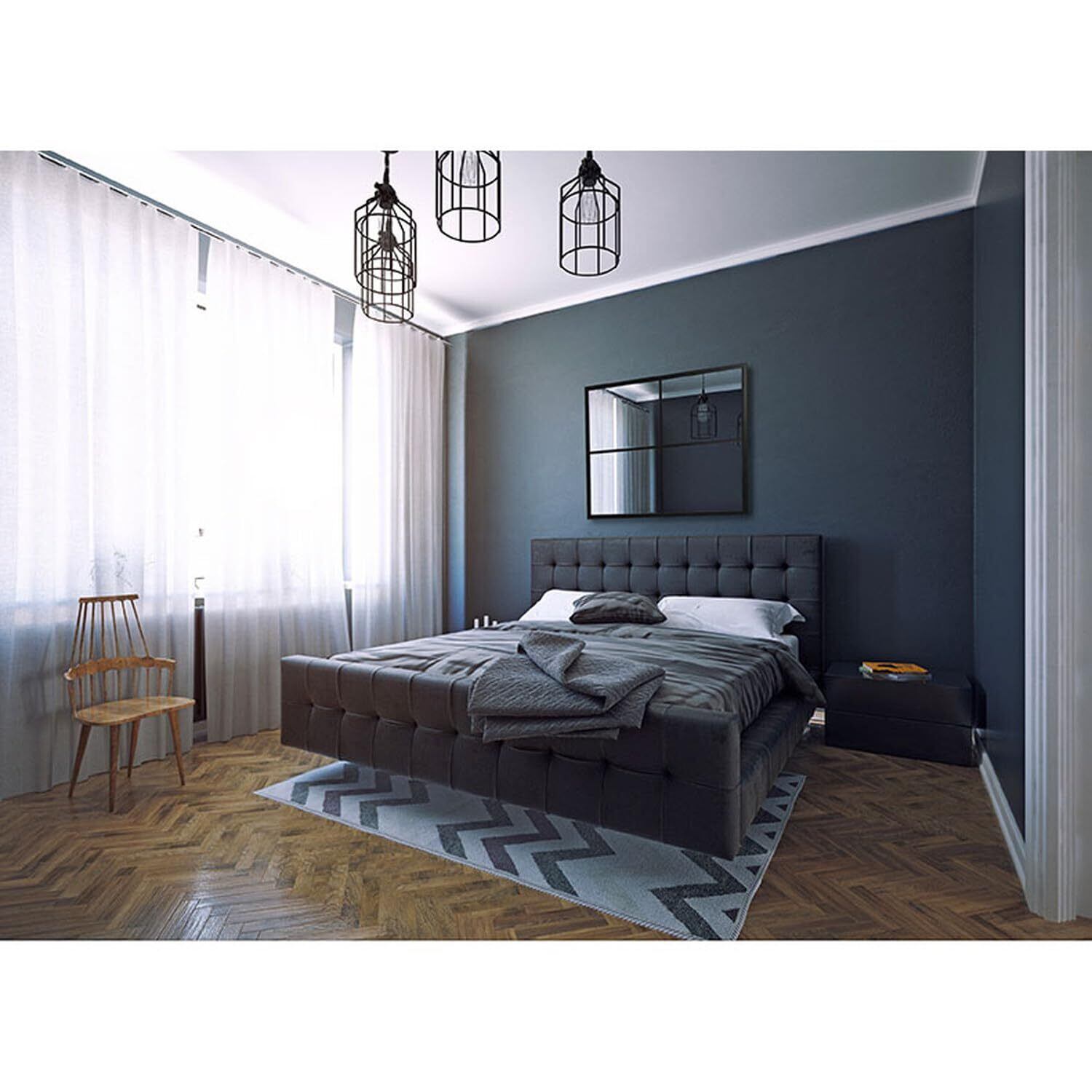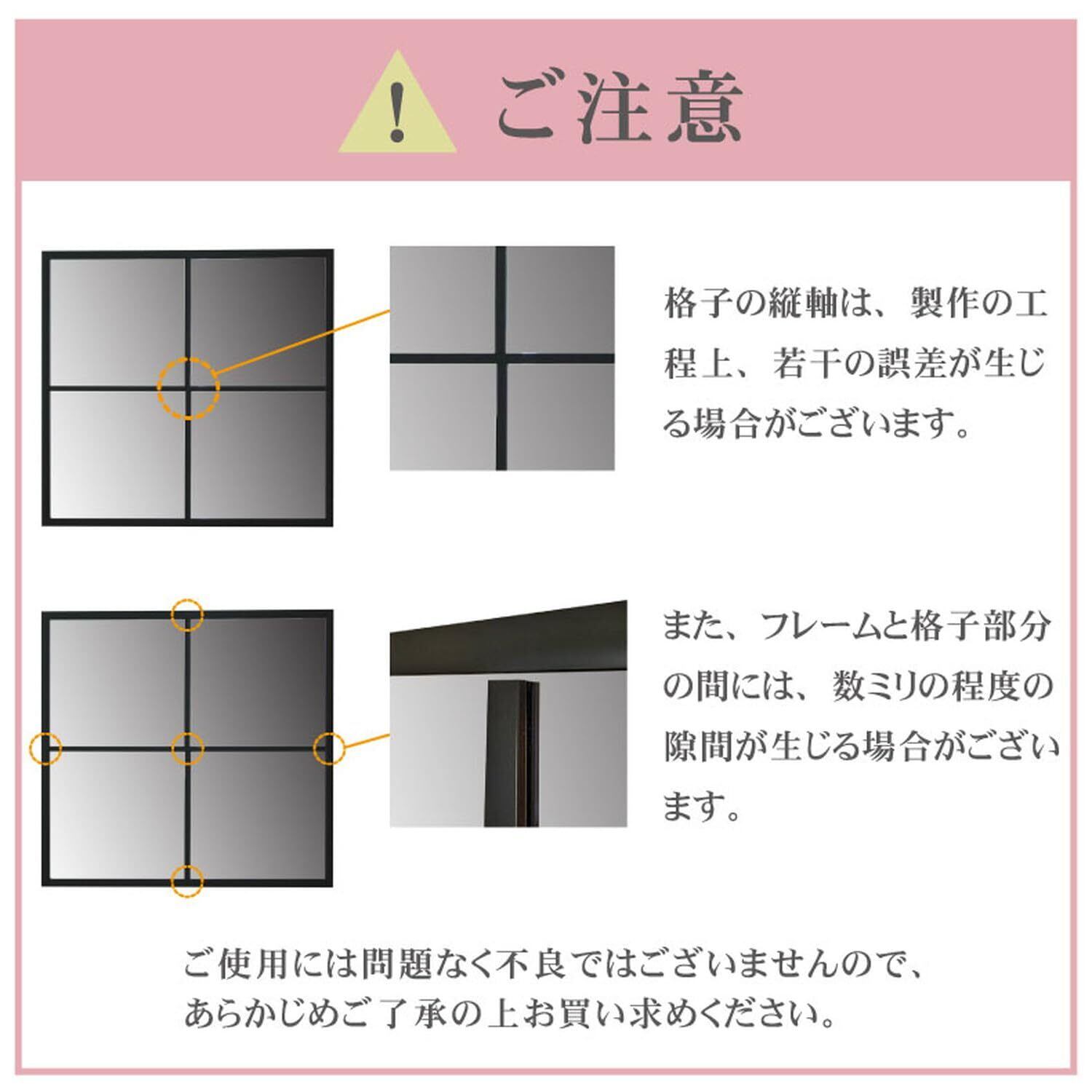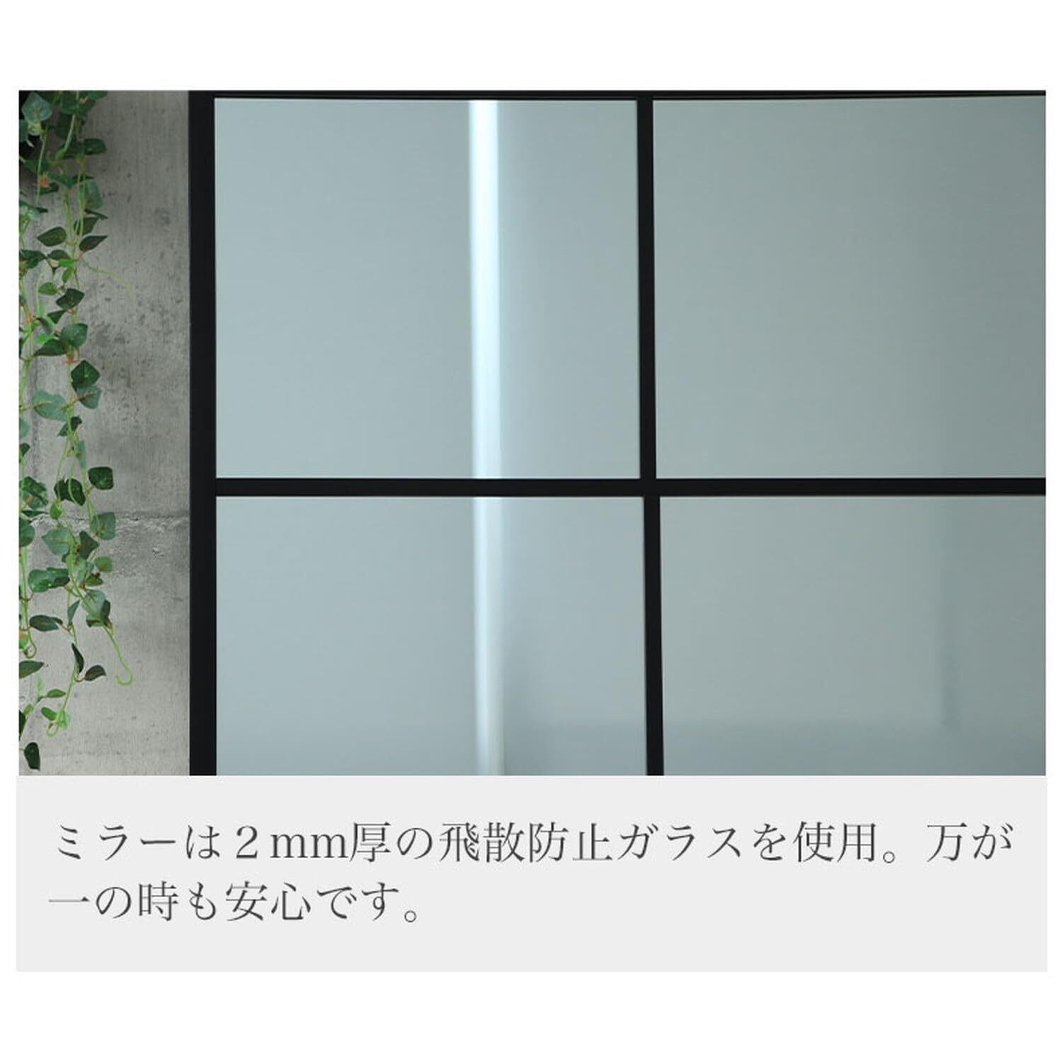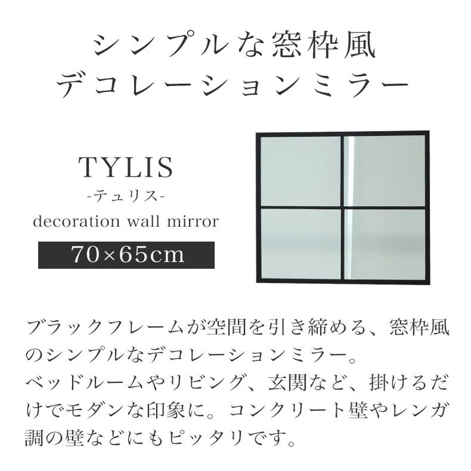 シンプルな窓風のスクエアデザインのウォールミラー「テュリス」。マス目状のブラックフレームがおしゃれなデコレーションウォールミラー。落ち着きのあるマットなブラックがミラーを高見えさせるシックなデザイン