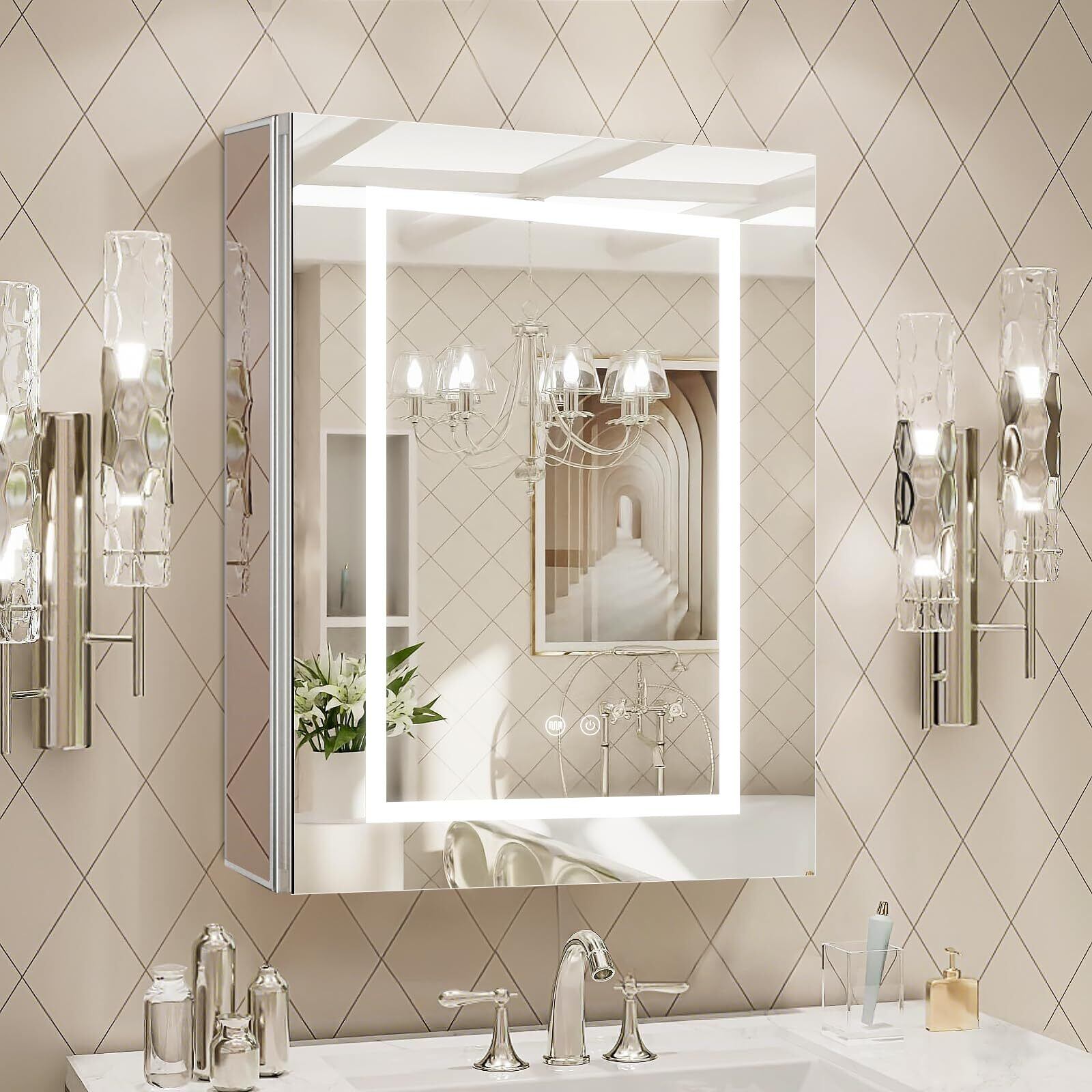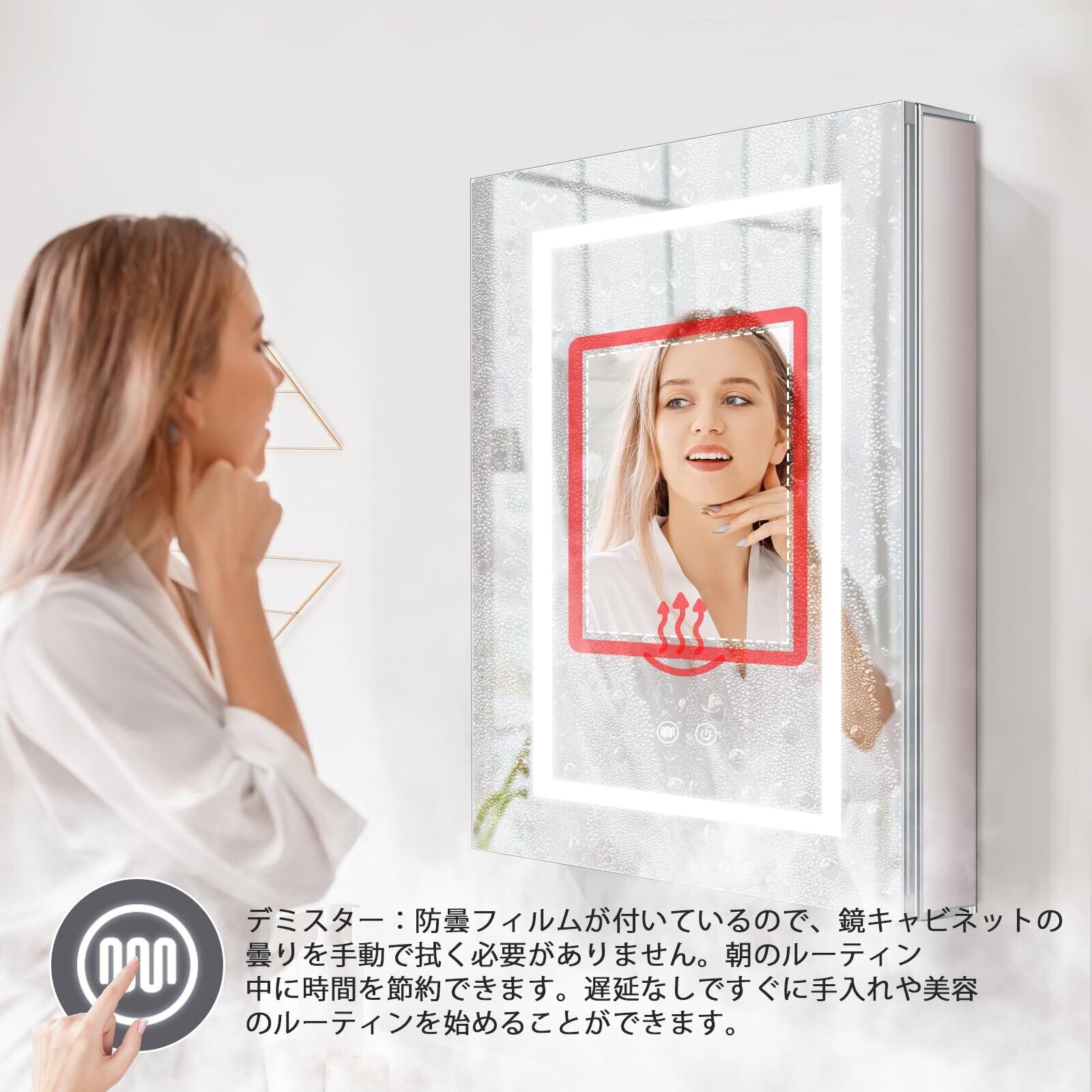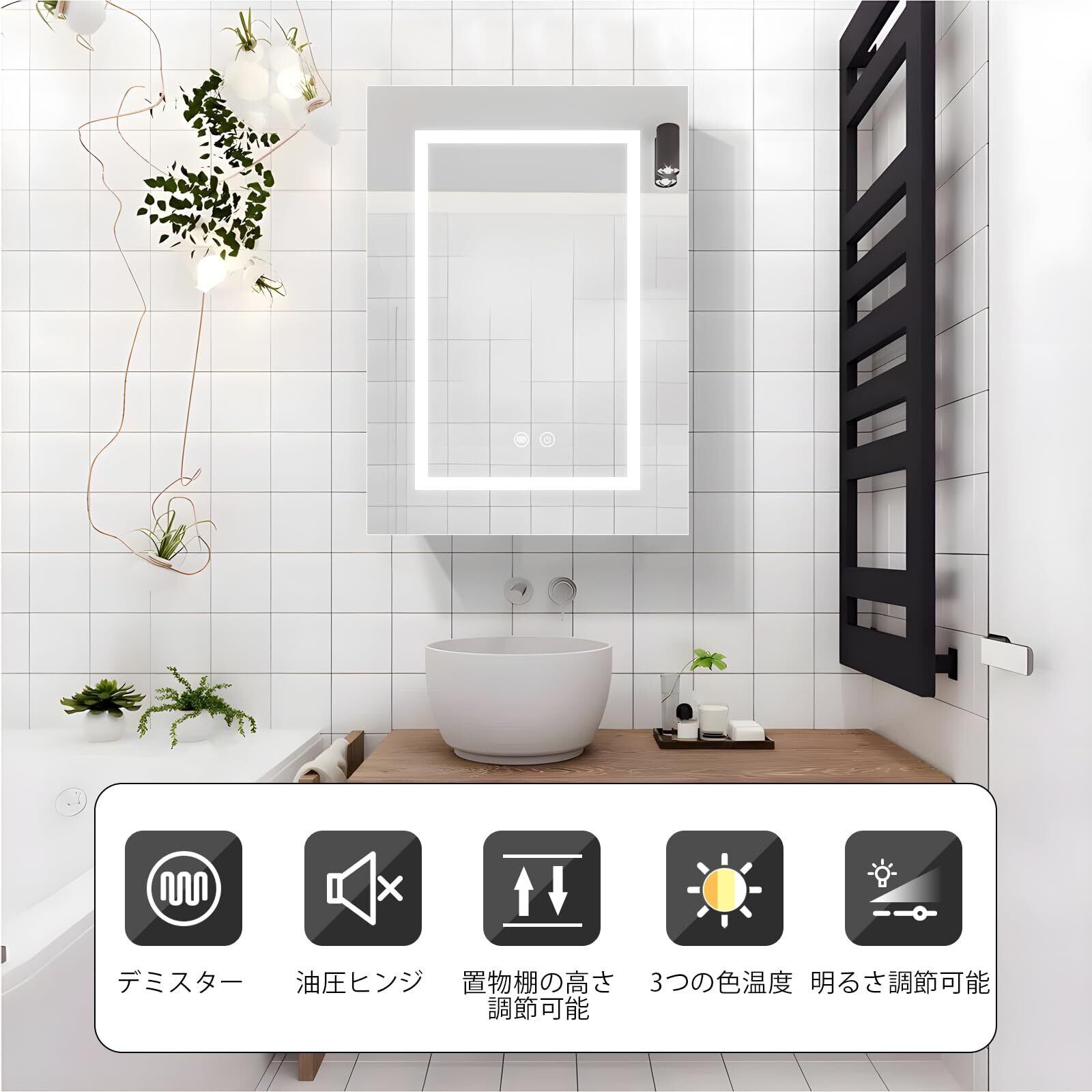 【2022最新】LEDバスルームミラーキャビネット,3つの色温度、明るさ調節可能、防曇機能,ぜんガラスめん,40×60cm,アルミフレーム,100-130V,47-63hz