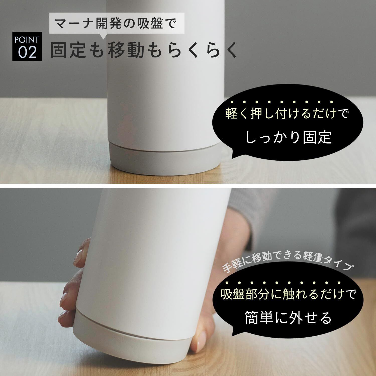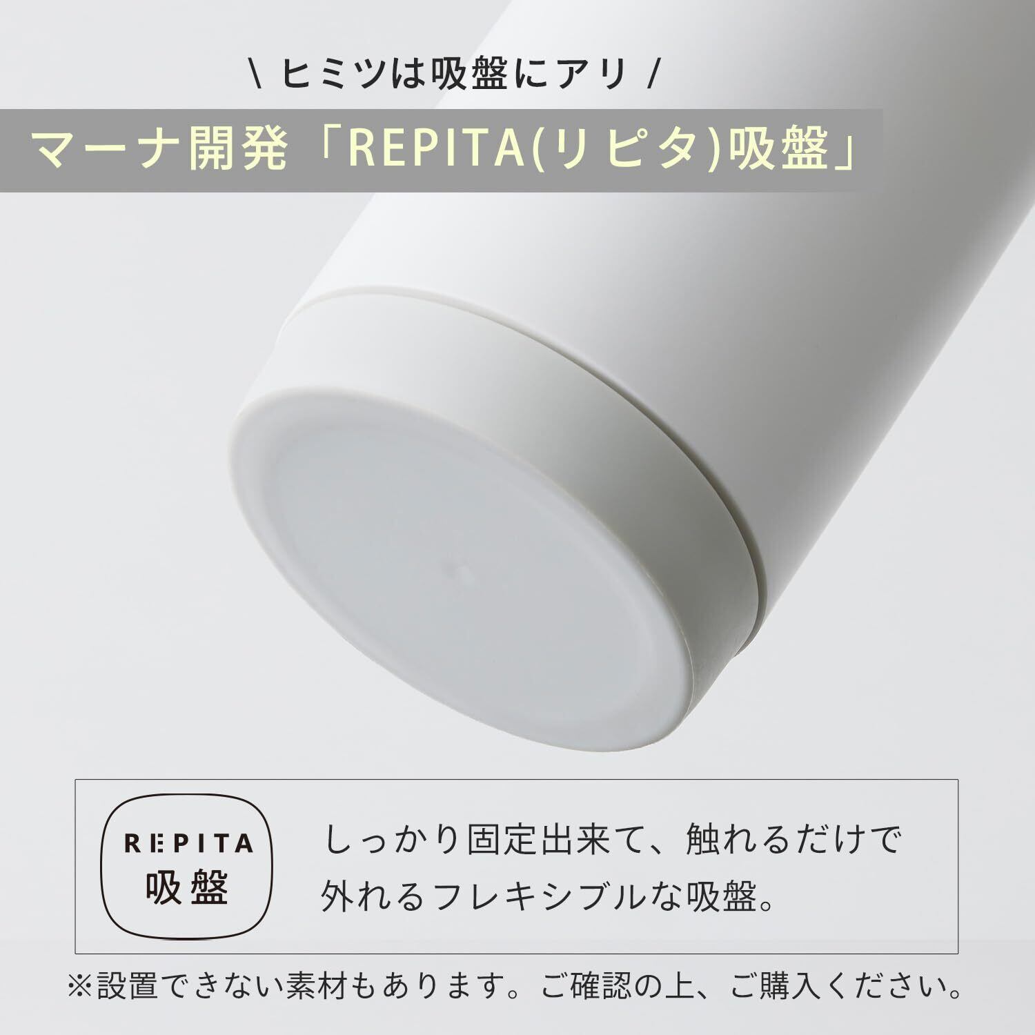【固定も移動もラクラク】マーナが開発した「RIPITA(リピタ)吸盤」。軽く押し付けるだけでしっかり固定できて、吸着部分に触れるだけで簡単に外せるフレキシブルな吸盤です。【設置できる素材】光沢のある平らな面でステンレス・透明ガラス・金属塗装面等【設置できない素材】凹凸、ザラザラ、艶消し面やコンクリート、コーティングされていない木面等【ご注意】取り付け面と吸盤部分の汚れ・水分・油分等をキレイに拭き取ってから吸着させてください。フタの開きが弱い場合は、一度シリコーンパーツを外し、再度組みなおしてください。