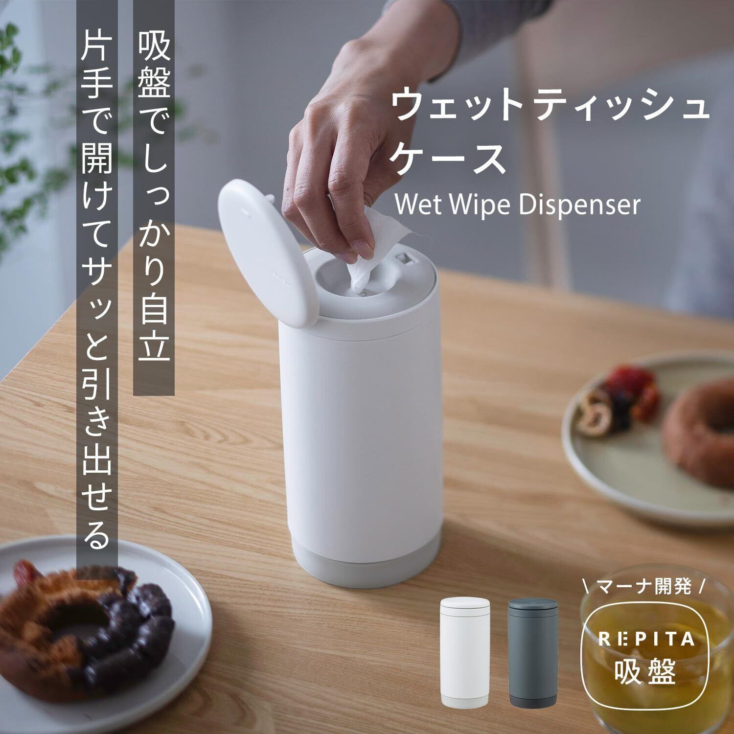 【ワンタッチで開けて引き出せる】指先が汚れていても、ワンタッチで開けてサッと引き出せるウェットティッシュケースです。吸盤でしっかり自立しているので動かず、押すだけで開閉。【対応サイズ】直径約8×高さ約14cm以内の詰め替え用ロール型ウェットティッシュが入ります。(70枚~100枚入り)