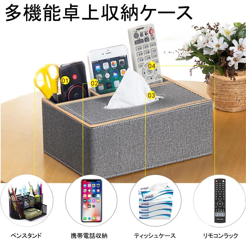 ティッシュケース PUレザー製 多機能収納ケース ティッシュボックス・ホルダー ペン・鉛筆・リモコン収納 卓上収納 仕切り付き 小物収納 オフィス用 家庭用 (金縁+グレー)