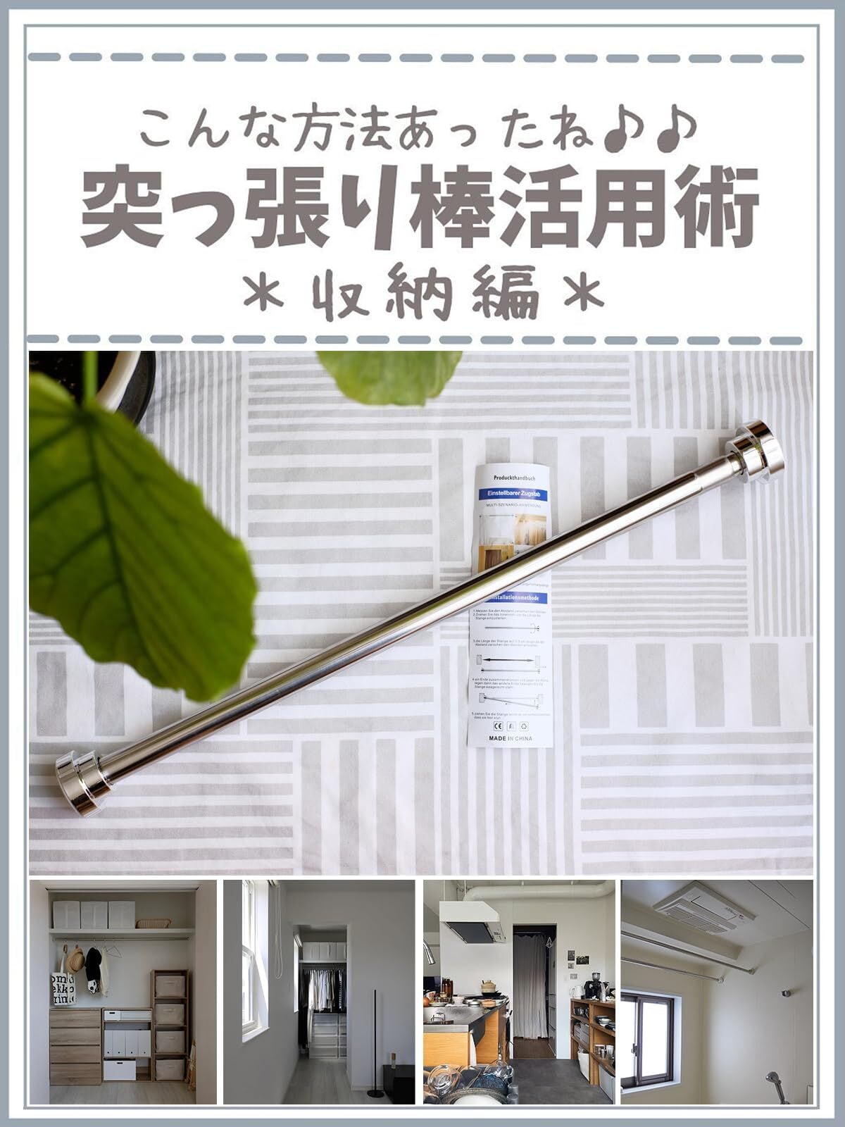 「工事不要・簡単設置」突っ張り棒の両端には強力なゴム製滑り止めを採用。穴あけや複雑な工事が一切不要で、一人でも簡単に設置できます。長いサイズも対応しており、広いスペースにも最適です。