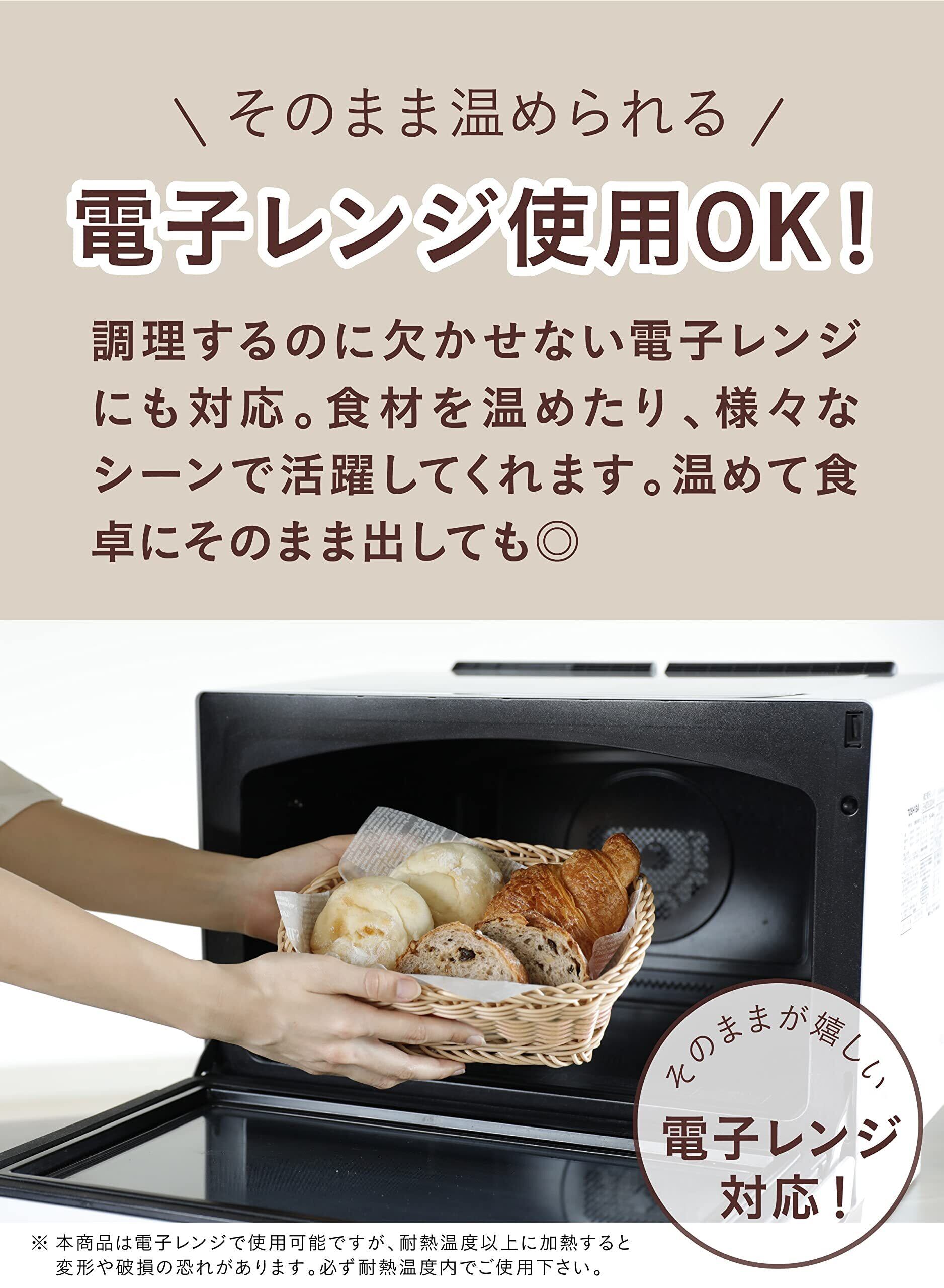 食材を少し温めたい時もそのまま電子レンジに入れることが出来ます。少し温めて美味しくパンを食べたい方にぴったりです。※耐熱温度内でご使用ください。