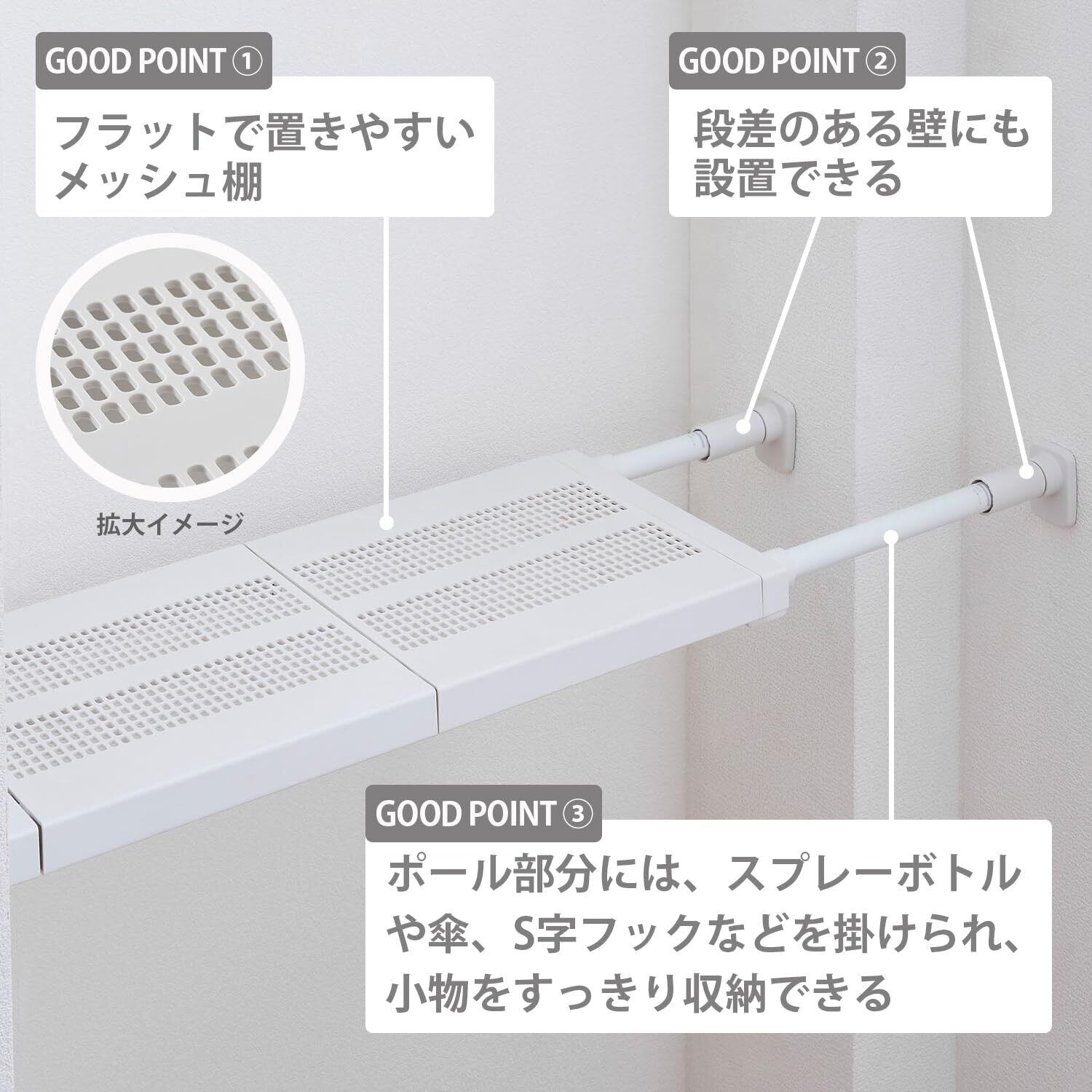 フラットなメッシュ棚板で小物が置きやすく、ポール部分には物を掛けて収納できる。インテリアに馴染むマットな塗装。