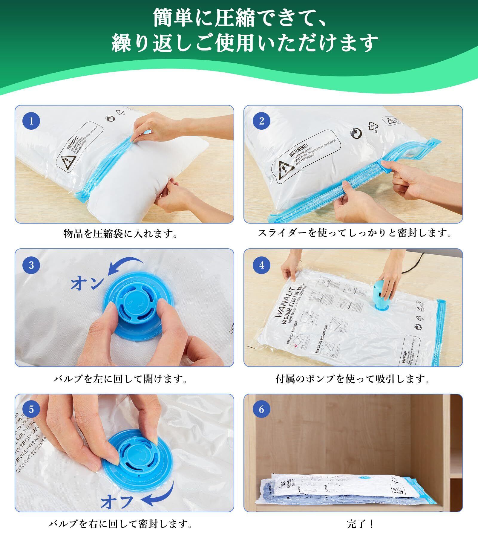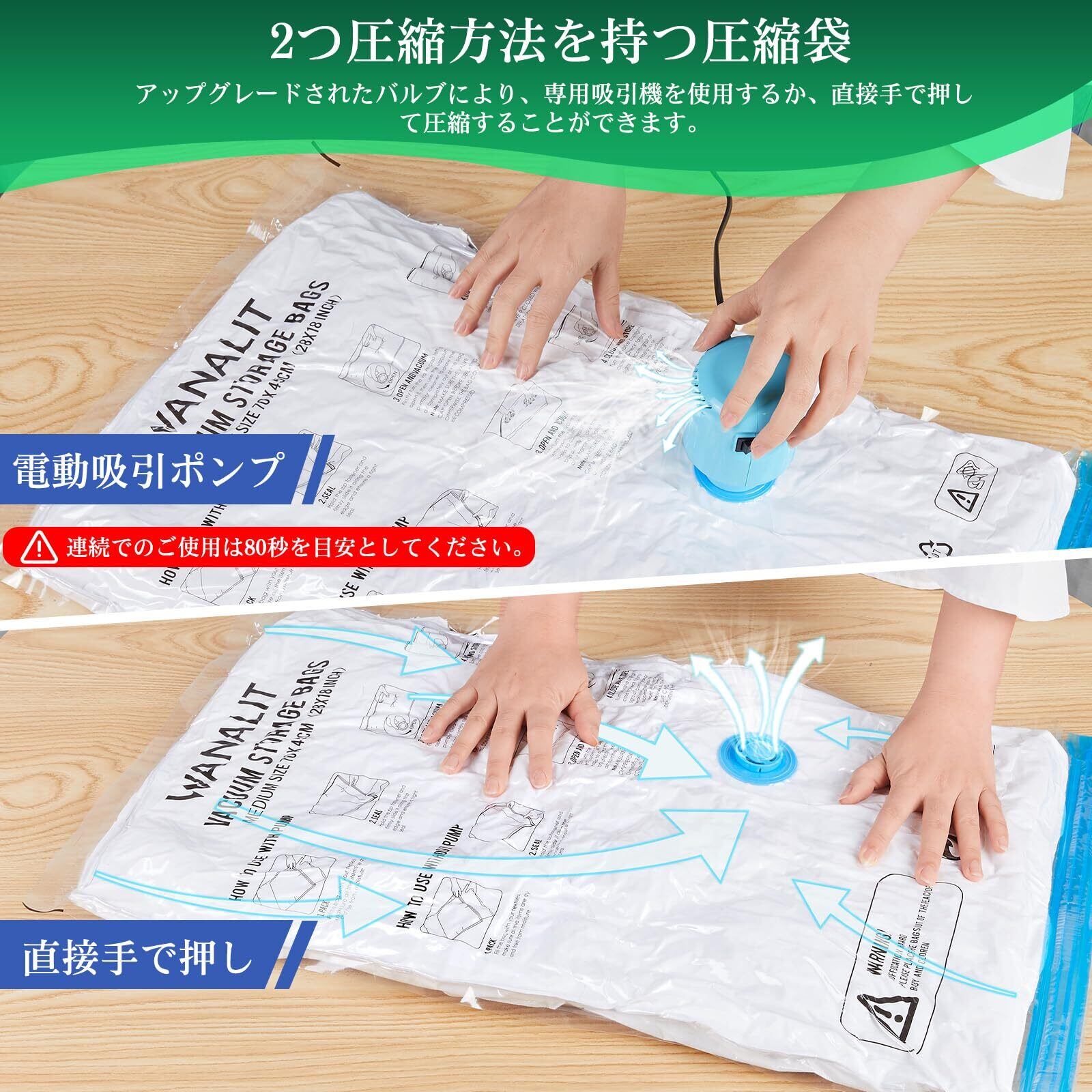 【容量を80%削減する布団圧縮袋】当社の衣類圧縮袋は、クローゼットの整理や衣類の収納に最適です。使用することで、寝室やアパートメントが整頓され、広々とした空間を実感できます。また、旅行時には旅行用圧縮袋としてスーツケースに効率的に荷物を詰め込むことができます。厚くて丈夫なポリエステル素材を使用しており、何度でも繰り返し使用でき、衣類を長期間保管することが可能です。